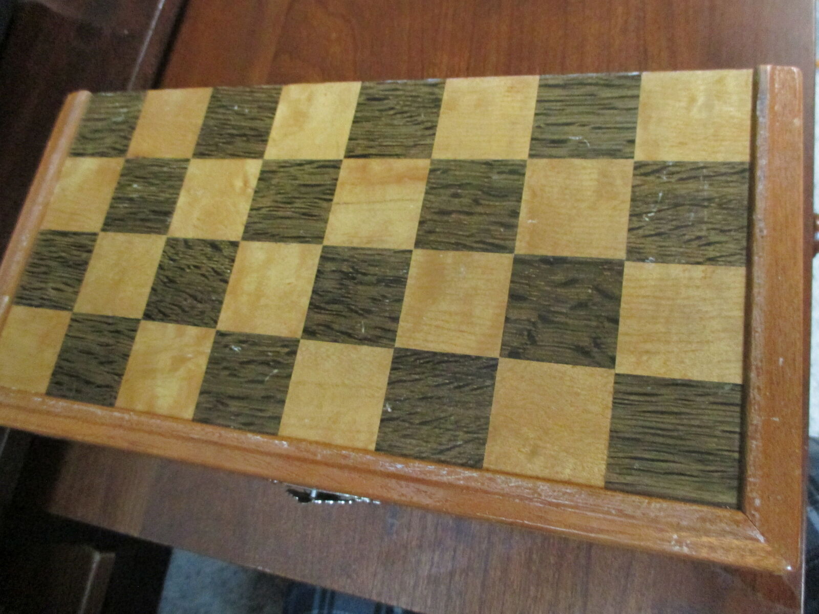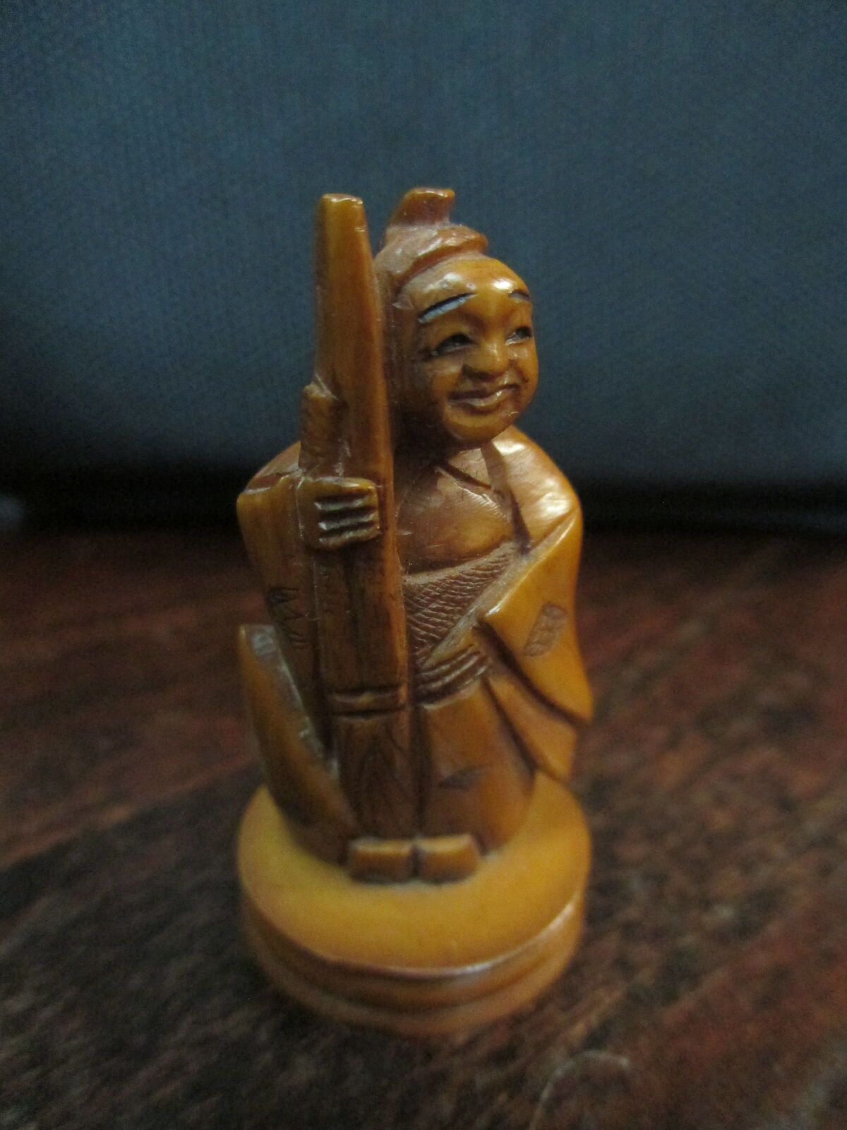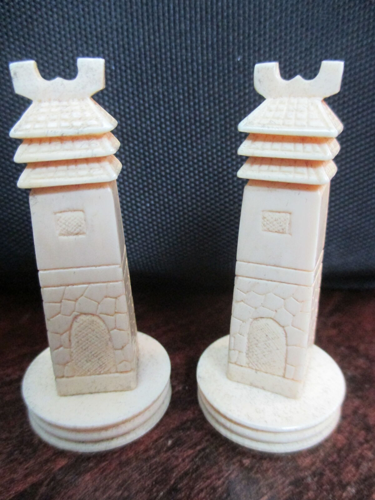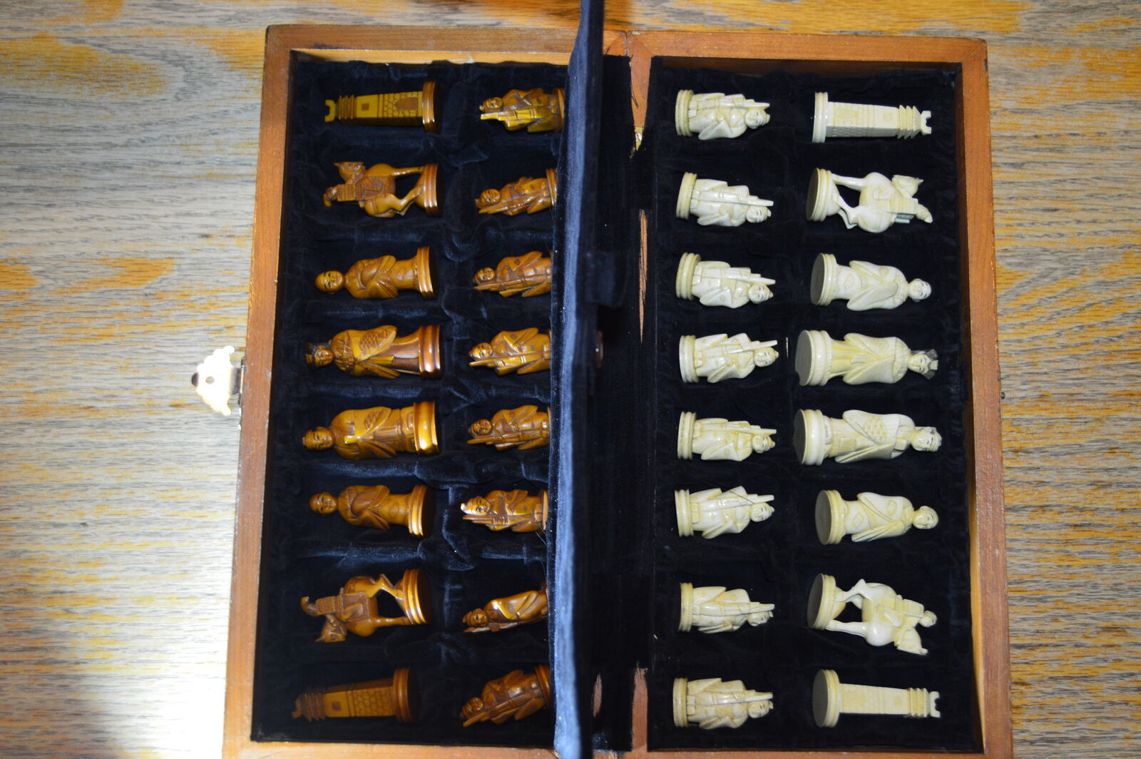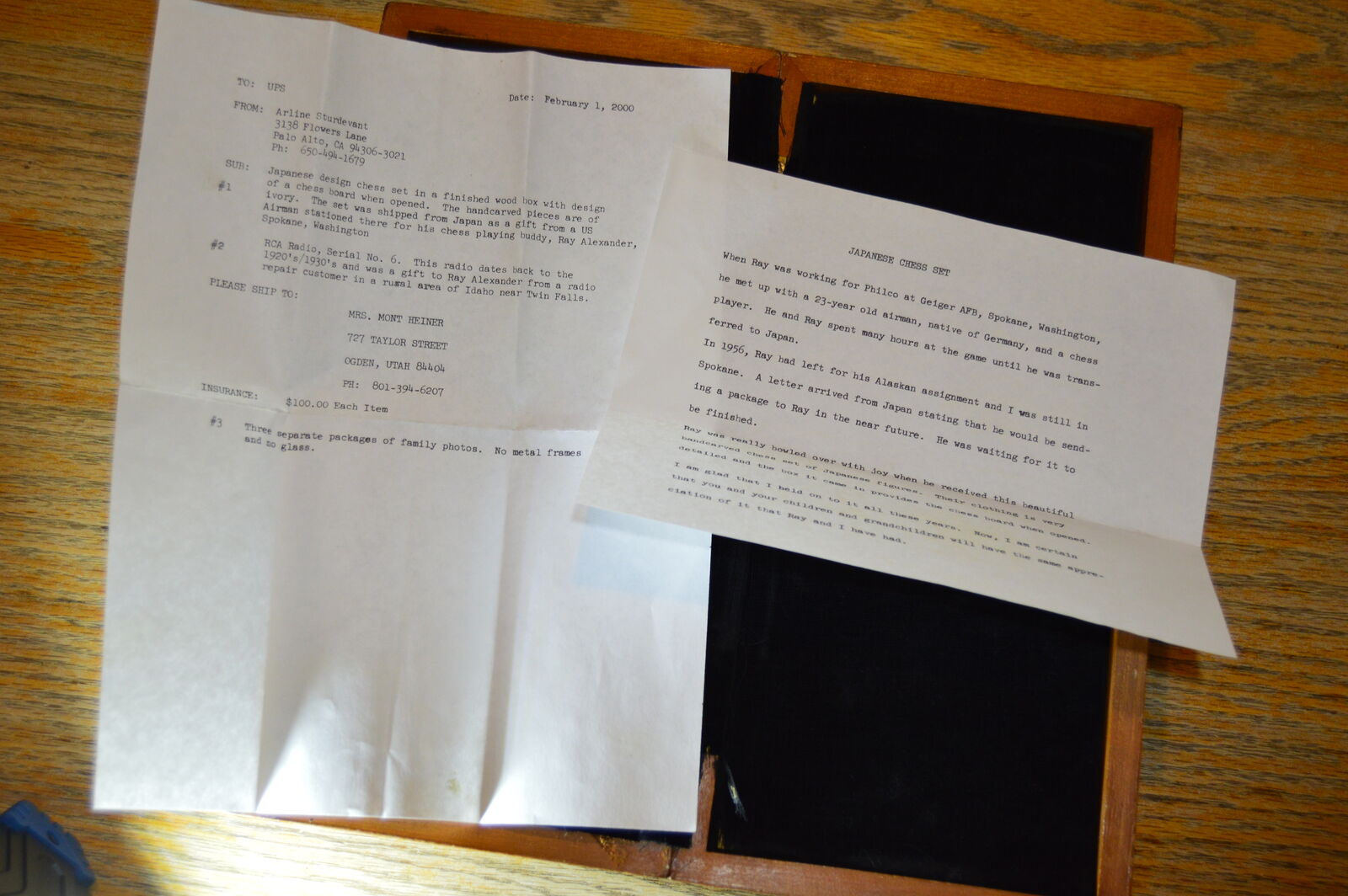 PayPalThis is a handcarved Japanese chess set made in the 1950's. The board is 12" x 12" x 1.75" and the tallest pieces are just over 2". The pieces are intracately carved and very detailed. One of the rooks has a small piece that has broken off (as pictured). The board has some scratches but is in good condition considering its age. It doubles as a case for the pieces which is lined with felt. One of the felt lined dividers has become detached do to wear and the felt becoming fragile in its old age. There is paperwork from the original owners with a brief history of the set.