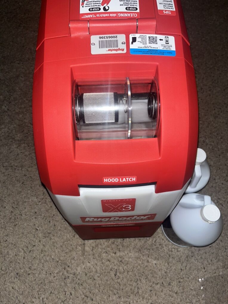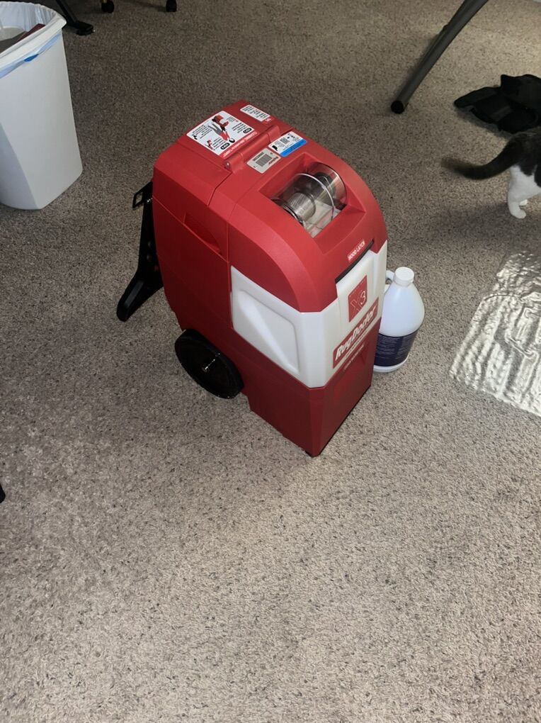 Rug Doctor Carpet Cleaner barely used. Bought originally for cat messes, but carpet cleaners can actually make the problem worse, so I no longer have use for it, only used it about 3-4 times. Sold with three gallons of solution used in it.