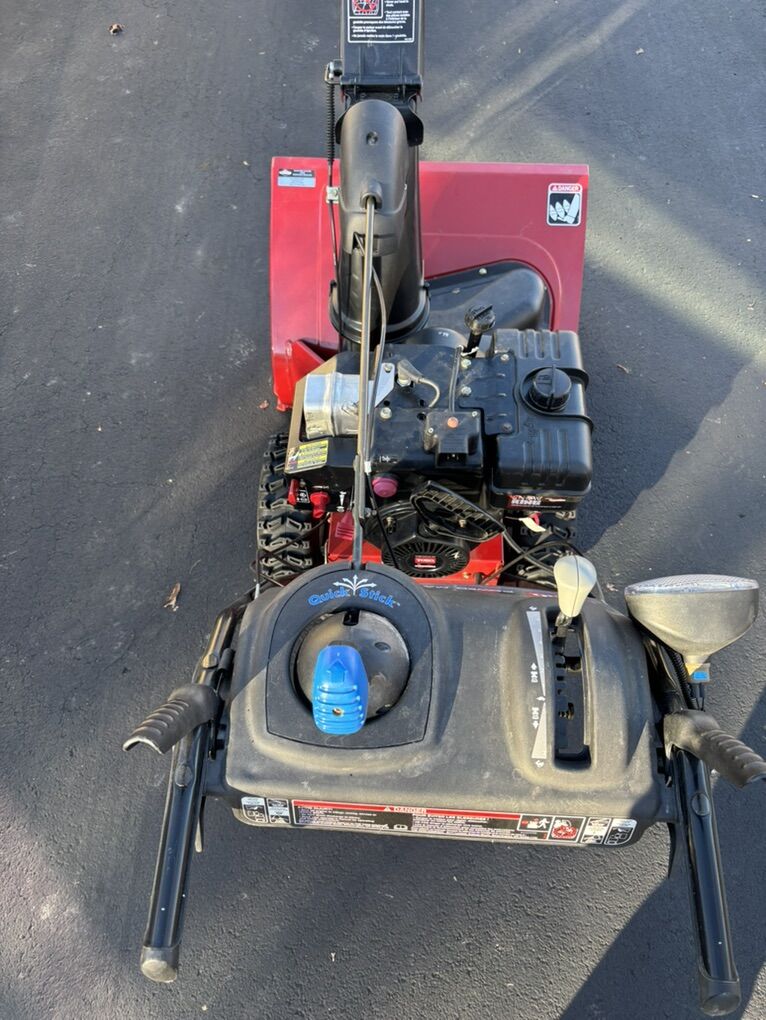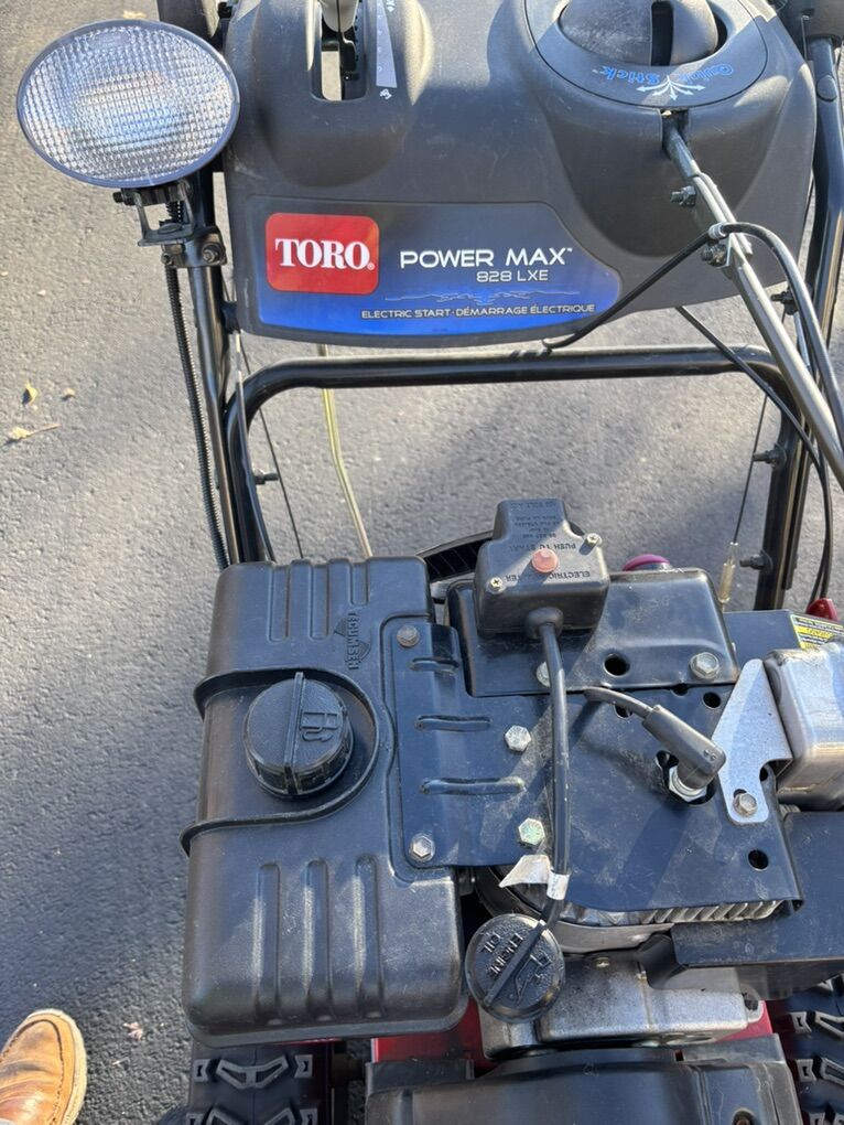 VenmoToro 828 XLE Powermax snowblower shoots snow out 25-30ft. Turn on a dime with trigger finger controls. Joystick control shoot for left to right as well as height angle control. 4 cycle(no oil mixture needed) 28 inch wide and 2 Stage snowblower. This is an amazing snowblower! Has an electric start as well. It is tough as nails, and a strong thrower! 6 forward speeds, 2 reverse speeds. It’s a beast! It’s awesome, come and get it before the next snow storm. I have tackled snow 2 ft plus high snow banks and it’s amazing what it can handle. You will not be disappointed.