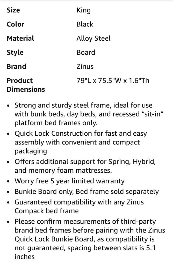 VenmoNew open box. Strong and sturdy steel frame, ideal for use with bunk beds, day beds, and recessed sit-in platform bed frames only. Quick Lock Construction for fast and easy assembly with convenient and compact packaging. Offers additional support for Spring, Hybrid, and memory foam mattresses. Bunkie Board only, Bed frame sold separately. Normally 147 on Amazon
