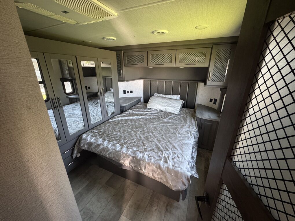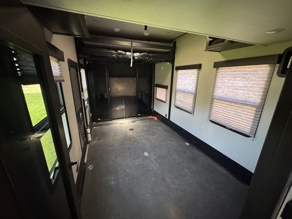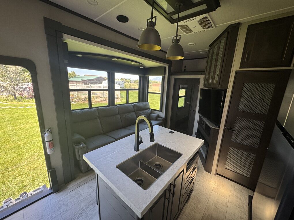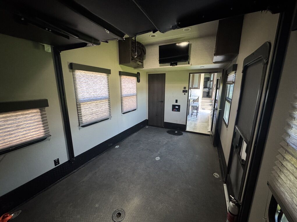 • Onan 5500 generator (low hours) • Full bathroom with sink, toilet, and shower • Half bath in the garage with sink and toilet • Full-size residential fridge • Convection microwave • Washer and dryer hookups • Electric fireplace with fan • Outdoor washing station • Touchscreen controls with Bluetooth connectivity • 2 AC units • Hydraulic auto-leveling system • Dual 6-volt batteries • 2 side awnings and 1 rear deck awning (all electric) • 2 fuel tanks (one for toys, one for generator) • Central vacuum system • Spacious modern kitchen • Sleeps up to 8