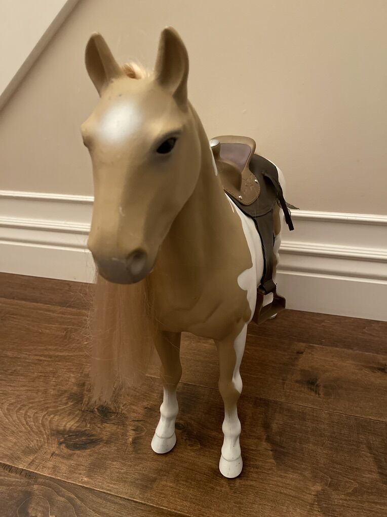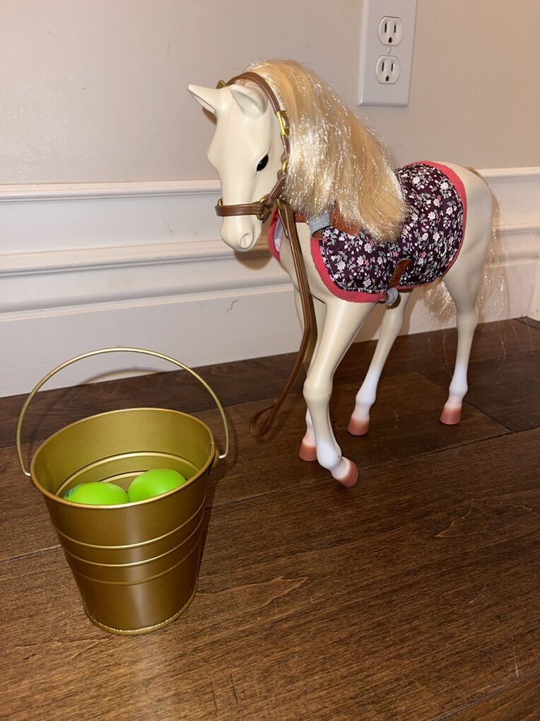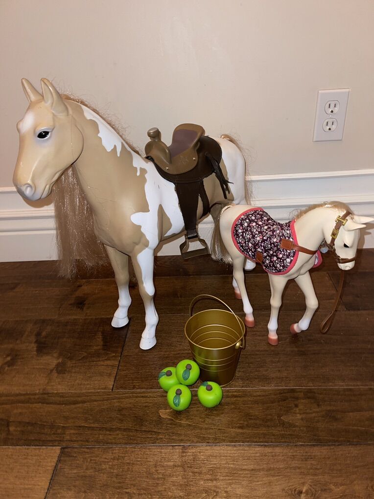 PayPalThis is a cute horse and foal set by Our Generation. The bigger horse is approx 20” tall and the smaller one is 12” tall. They comes with a bucket of apples. These are made for 18” dolls. It’s $20 for the set.