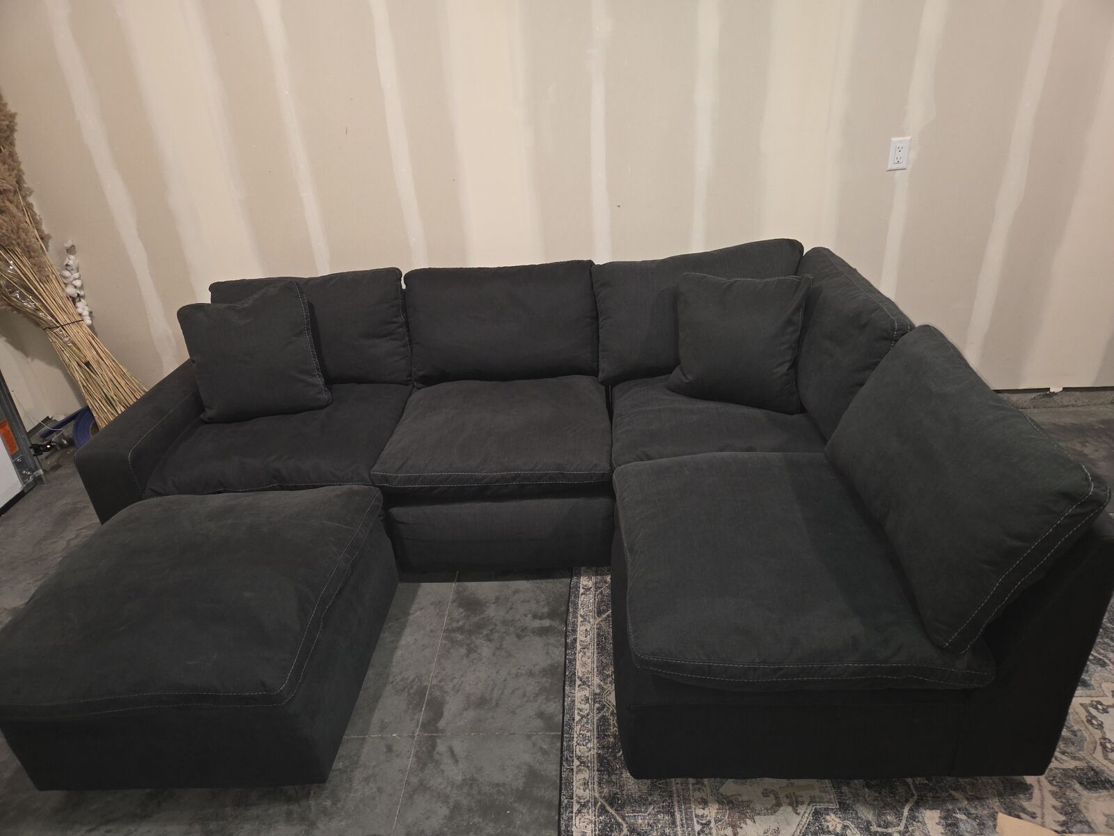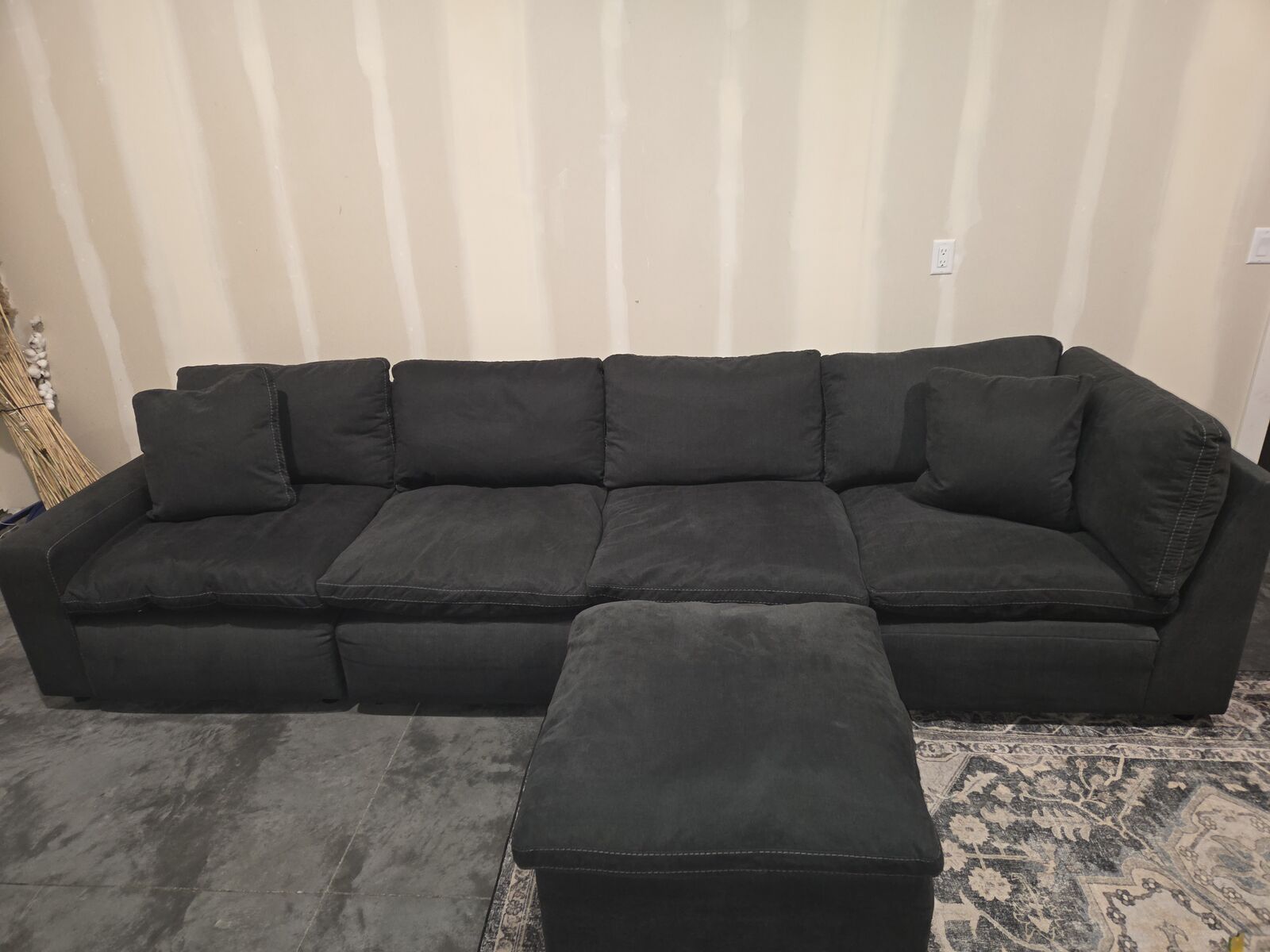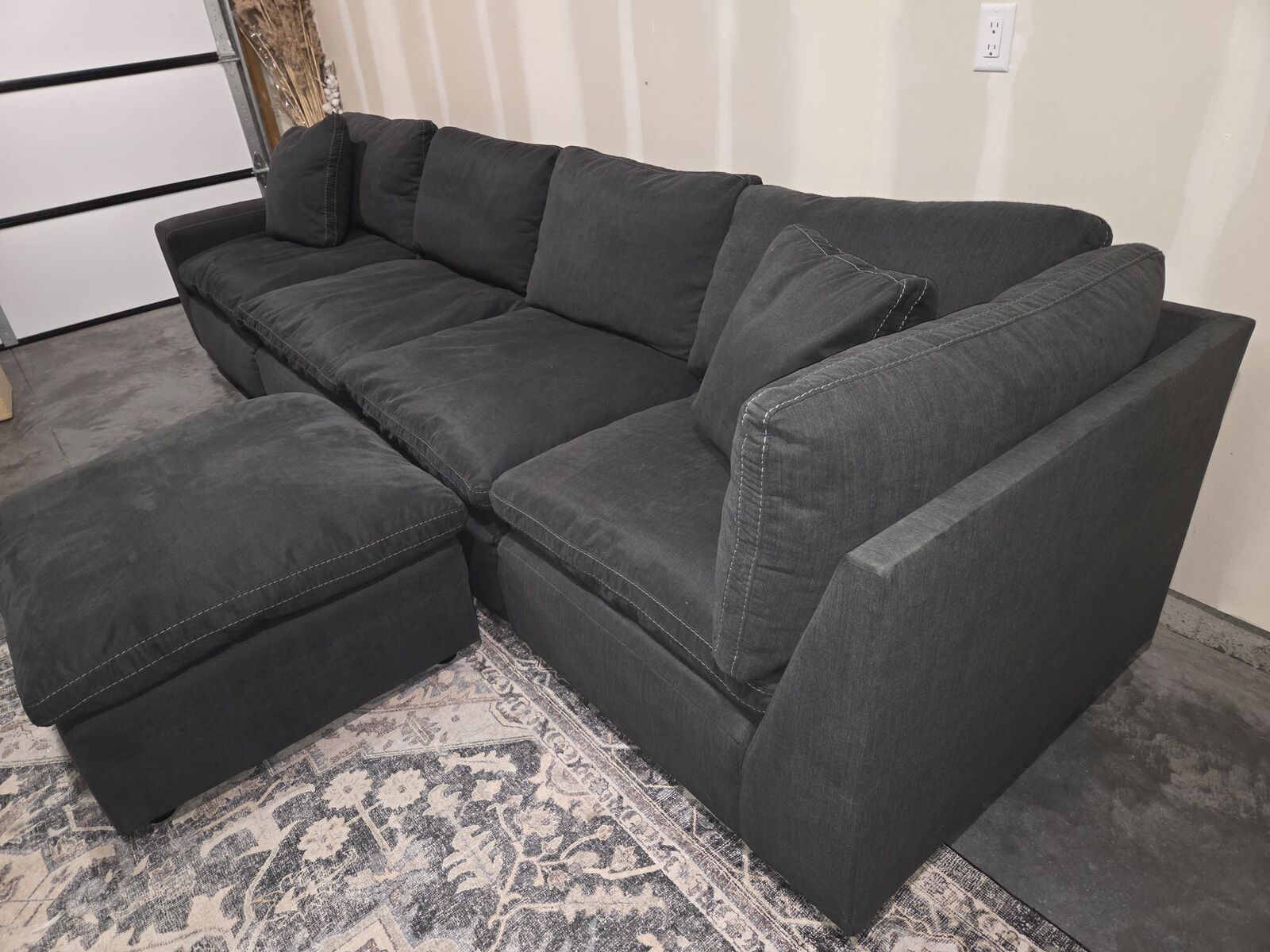 Amazing sectional. Lightly used like new with ottoman. Can arrange to fit your space. All backs and seat cushions can be removed. Dark navy charcoal color with grey stitching.