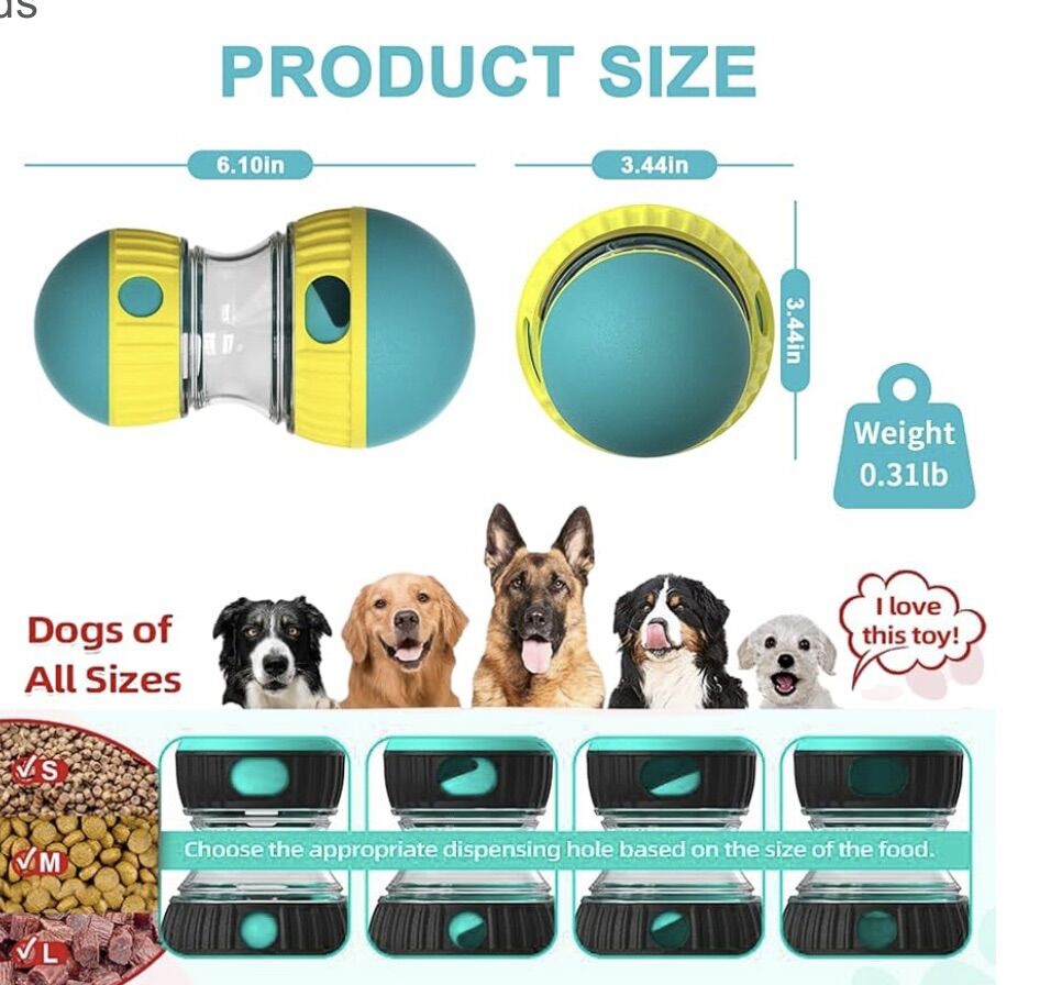 VenmoKADTC Super Ball Dog Treat Dispenser Toy. • Interactive Design: A puzzle ball that dispenses treats or kibble as the dog rolls it around, providing mental stimulation and physical activity. • Adjustable Difficulty: Features dials on the sides to control the size of the dispensing holes, allowing you to regulate how fast treats come out. • Durable Material: Made from tough, food-safe material designed for chewing. • Easy to Clean: The product