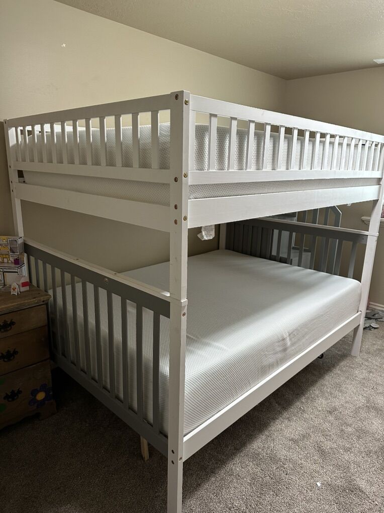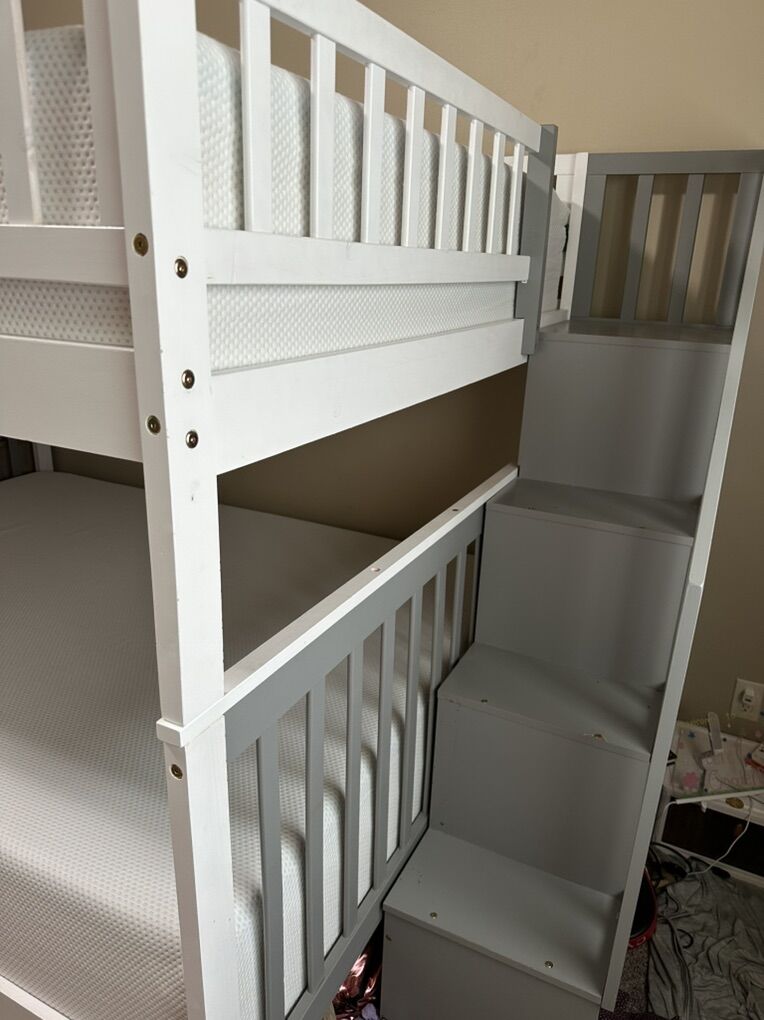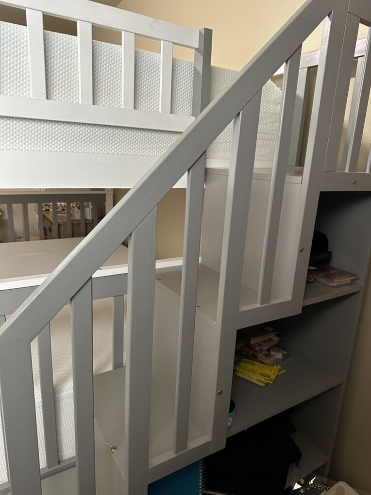 ZelleSet of queen size bunkbeds! White and grey with attached stairs. Stairs have storage shelves on side. Mattresses are included, and set is currently broken down into larger sections (just trying to limit the pain of putting them back together)!
