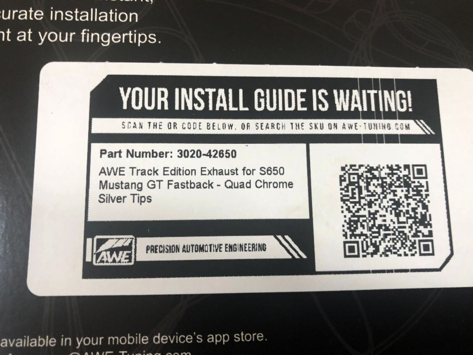 Presenting the AWE Cat Back Exhaust for the Ford S650 Mustang GT. You're looking at the Track Edition - the rowdiest version of the lineup. The AWE Track Edition has minimal filter in the rear via dual straight lengths of 3" stainless steel - it's light, it's loud (in & out), it's cost-effective, and it isn't for the faint of heart-you've been warned (and for this reason, the Track Edition can not be returned for sound reasons!). Full 3" & modular, the Track Edition features a full 3" design with modular, slip-fit inlet adapters for perfect mating with the factory headers, while facilitating a dual 3" connection for drivers looking to get spicier upstream one day (or now). And thanks to the precision AWE H-pipe, your 5.0L V8 will produce a deep, rich muscle tone with minimal wrasp (unlike an X-pipe). The Track Edition features straight-through bullet-style resonators in the mid pipes to further defeat wrasp, which becomes especially helpful should you upgrade your headers. When it comes to power to the pavement, we're looking at dyno-verified gains of +12 hp and +10 lb-ft of torque at the wheels on an otherwise stock vehicle. The full AWE Track Edition is 100% emission-friendly, not interfering with any factory emissions equipment. Bringing up the rear are quad 4.5" slash-cut, double-walled, and individually adjustable tips, available in chrome silver or diamond black. Made in PA, USA: engineered, designed, and manufactured in-house at AWE using US-sourced .065"-wall T304L stainless steel. All this plus 50 state emissions compliance.
