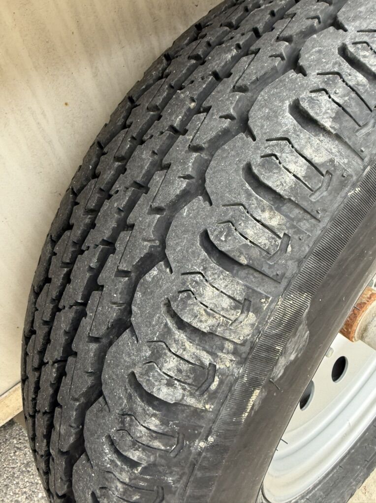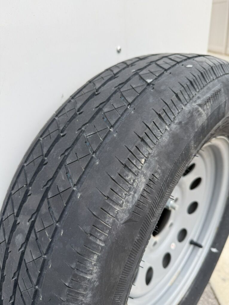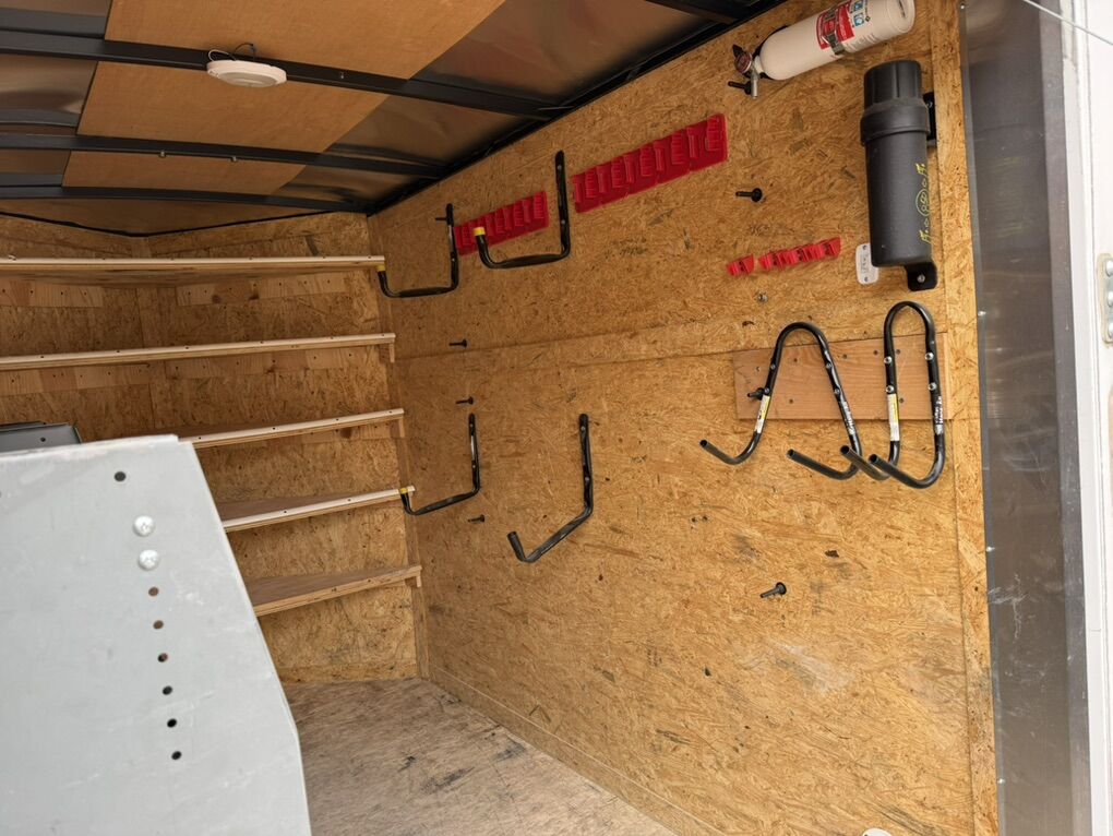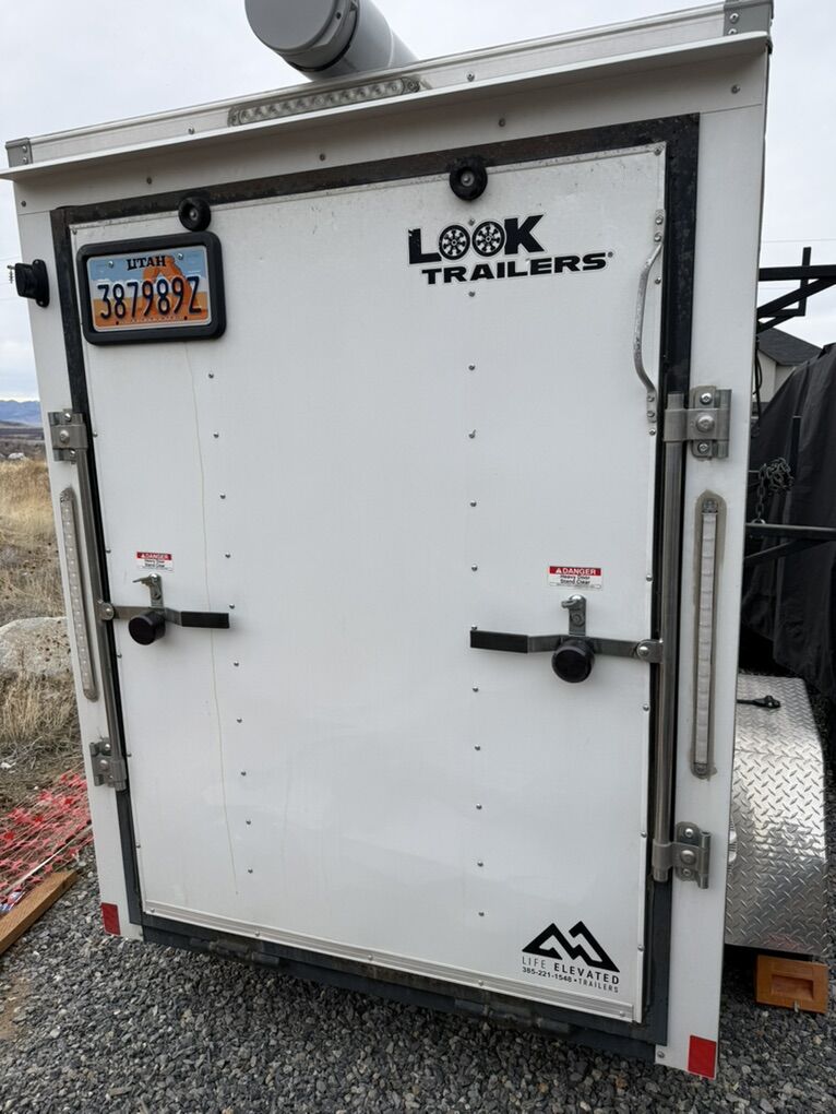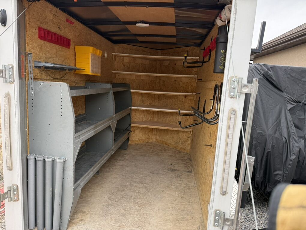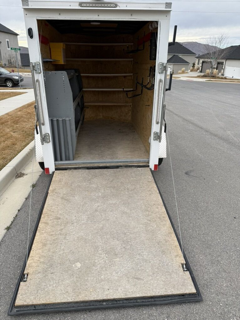 Built on a steel frame with a V-nose profile. Offers a rear ramp door. We upgraded to a van and no longer need.