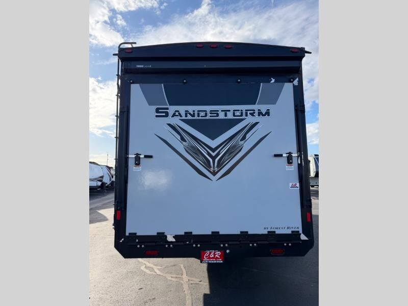 Each Sandstorm toy hauler fifth wheel and travel trailer by Forest River features a 102" wide-body construction to bring along four-wheelers, dirt bikes, or kayaks! You will find convenient amenities, such as 220 watts of solar power and a regulator with power boost, a 35 gallon fuel station, an outside shower to wash off your gear, and more. There is also a power awning with LED lights outdoors to create an outdoor living space, plus heated and enclosed tanks to camp all year long. The interior includes LED accent lighting, black night shades throughout, and a glass shower to name a few comforts. And don't overlook the available options that can added to customize your toy hauler just the way you like it!
