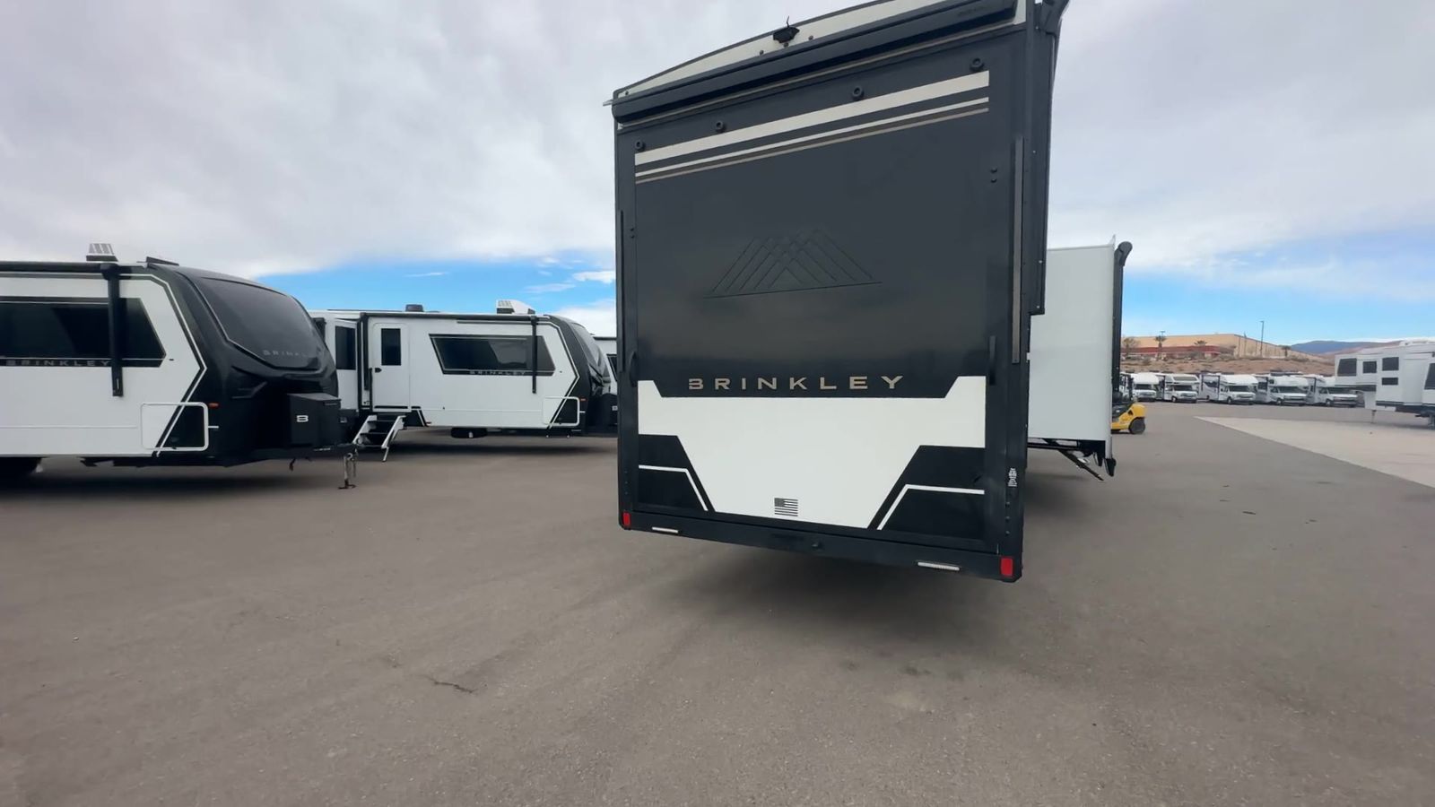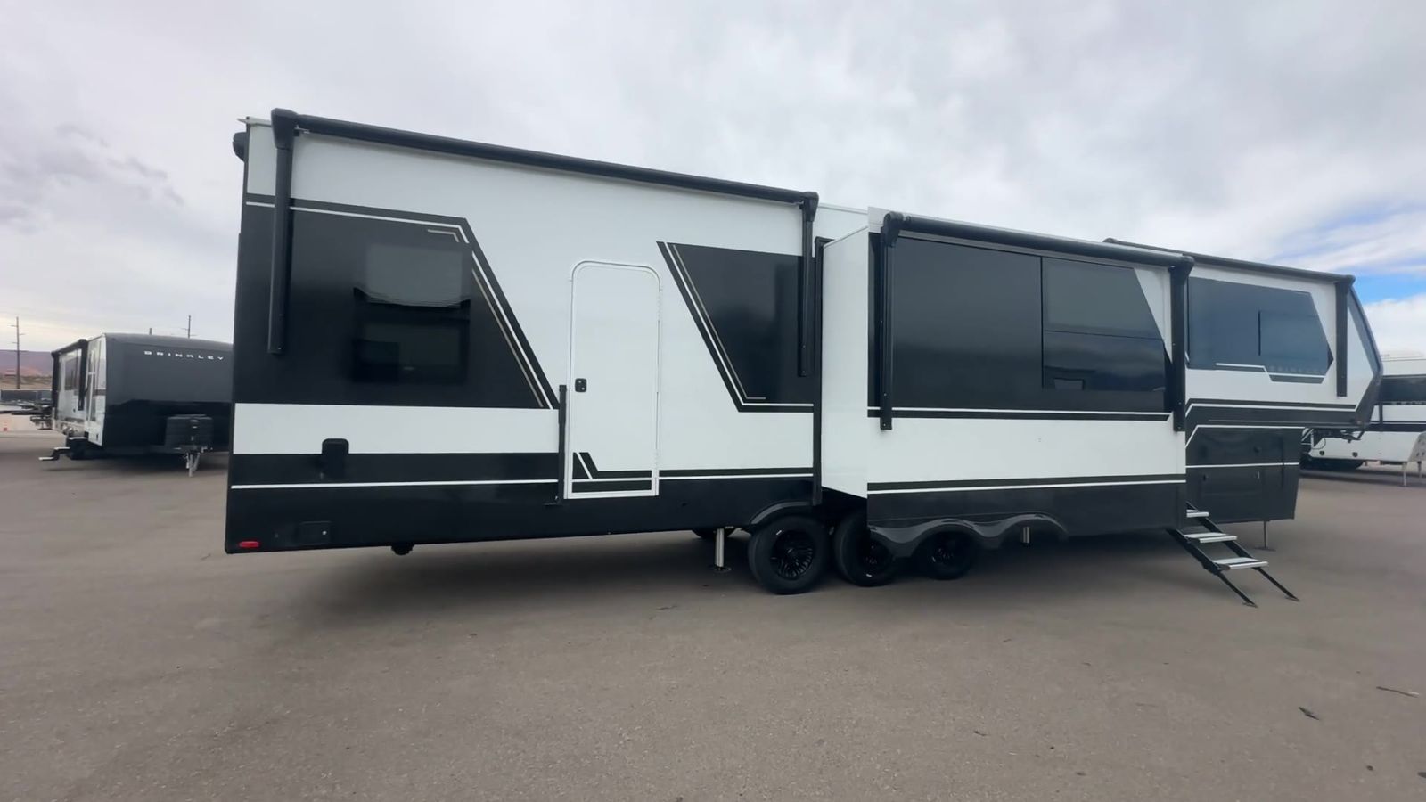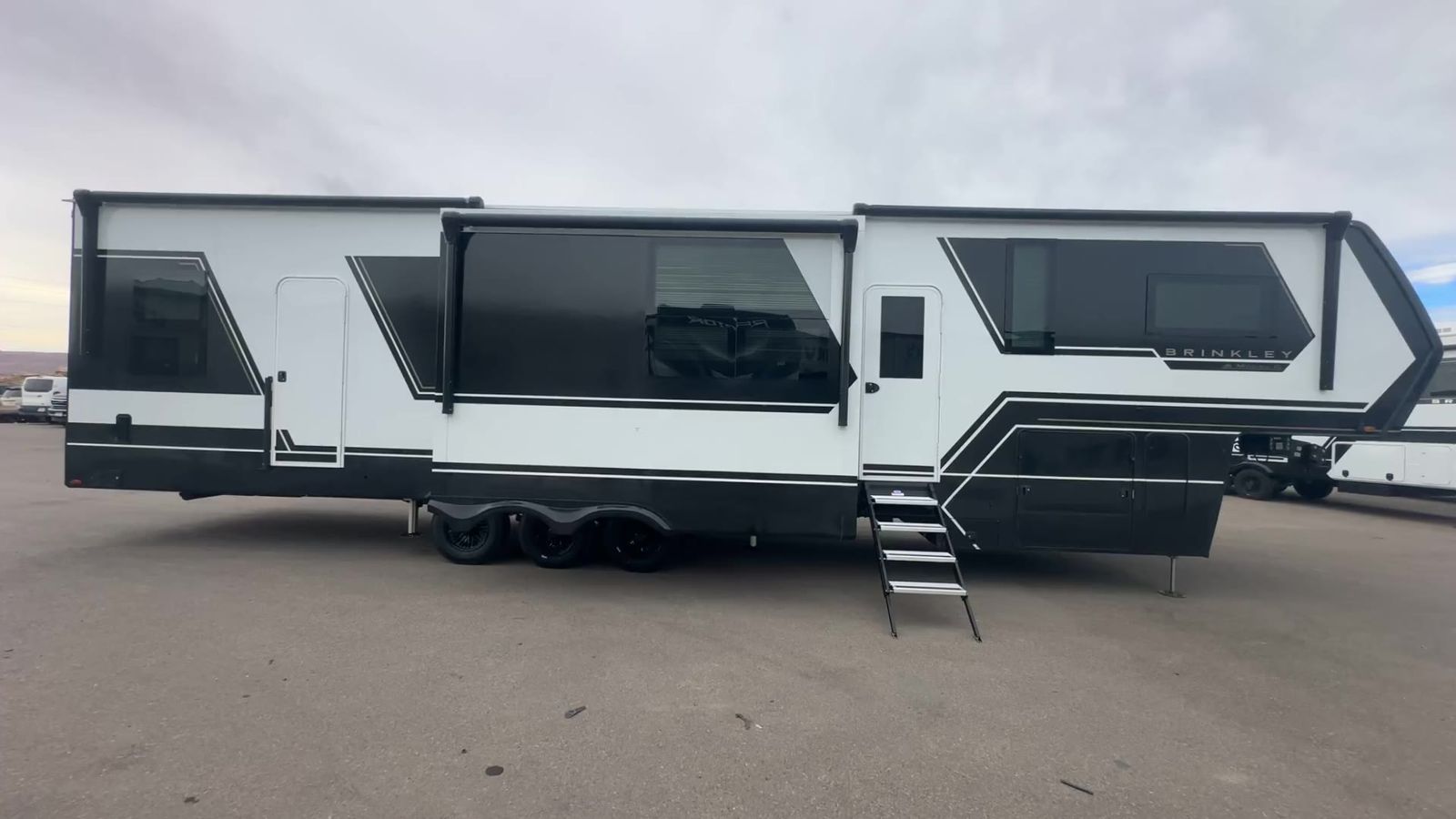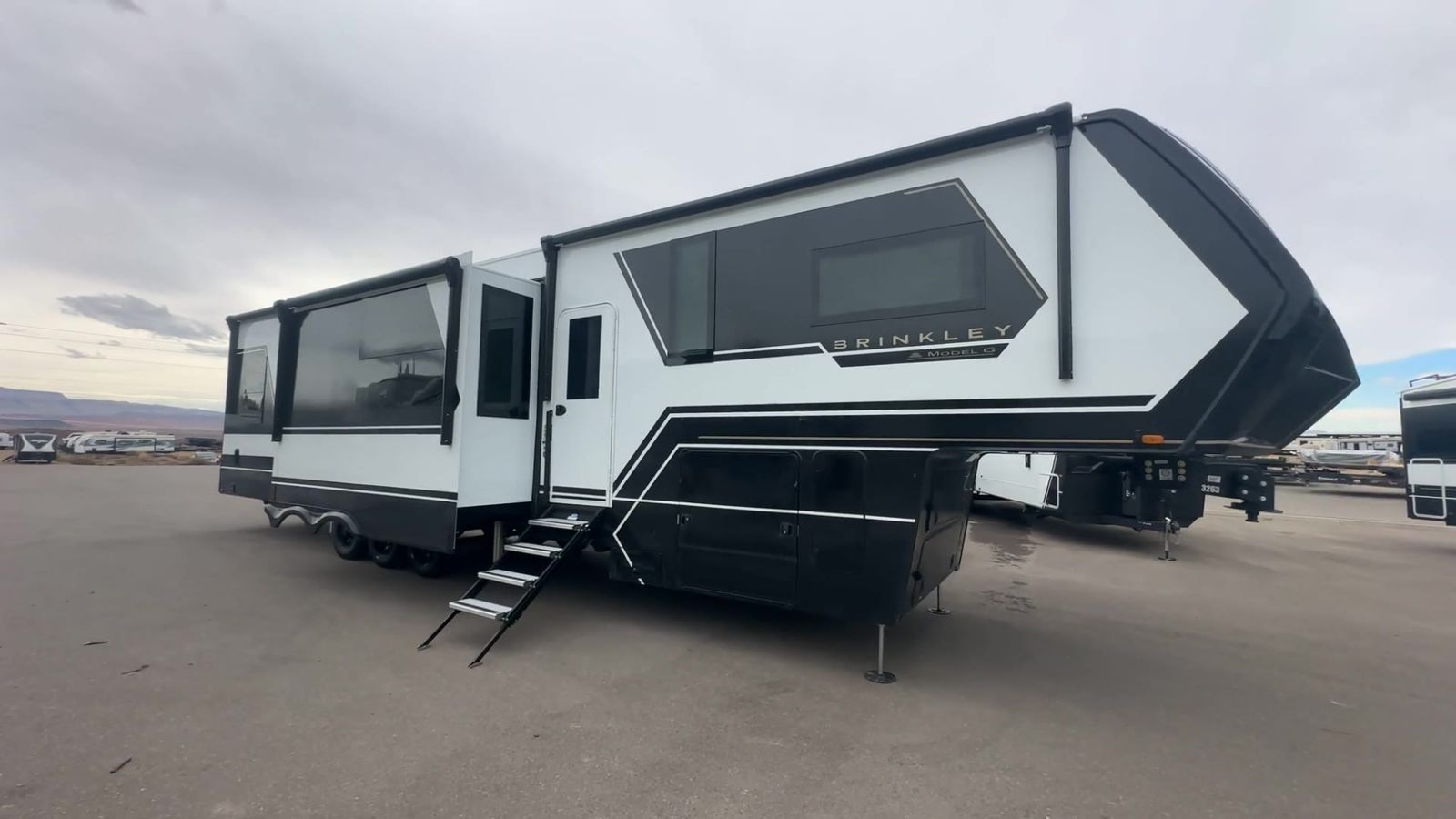 Brinkley Model G toy hauler 3950 highlights: 14' Garage with Loft L-Shaped Sofa 19 Cu. Ft. Refrigerator King Bed Slide Out Pull-Out Trash Bins Walk-In Bedroom Closet Bath and a Half This toy hauler may just be the one you've been looking for! The garage/flex space with fold-away half bath walls will allow you to utilize the garage how you need it, plus there is an adjustable tie-down system, independent dual sofas, plus a loft for storage and a twin bed to sleep more campers! The garage patio with a 1,500 lb. capacity is another feature you are sure to love, especially with its own awning to keep you protected from the elements. Head to the kitchen to prepare meals with a 24" GE oven with a four-burner range, a GE microwave with an air fryer, plus a spacious GE Energy Star 19 cu. ft. refrigerator. The island with two stools will let others visit with you while you cook, and there are even hidden dog bowls. You'll find the convertible dining table/L-desk will be accommodating since it can be used to dine at, and to get some work done. You may just find yourselves spending most of your time on the L-sofa in front of the TV and fireplace. A full bath is up front by the bedroom, and here you'll find neon shower lighting, a residential shower system, and pull-out linen storage to keep towels ready to use. After a day outdoors you'll love nothing more than coming back to your own bedroom with a king bed slide out, TV, a walk-in closet, and many more storage spaces. And we haven't even touched on the exterior features, like the 3-way pass-through storage, four power awnings, an air compressor to fill up tires, and the list goes on and on! With any Model G toy hauler fifth wheel by Brinkley you will enjoy luxurious amenities, tons of storage space, and innovative features that have been developed and tested in the real world. Durable construction includes an industry leading PDI process, an industry best insulation package, and reinforced and walkable slide roofs. Some of the exterior features you'll find are a 3-way pass-through with a multi-functional flip-up bulkhead wall, under I-beam storage, a MAX-Vision reverse lighting system, and a low-maintenance roof to name a few. A Rockford Fosgate audio system comes standard, along with a OneControl app system that lets you control your fifth wheel's functions right from your mobile device. You will find the solar system with a designated storage area to be ultra convenient, plus there is a FlexPower 5500 with a dual fuel inverter generator for all your power needs. Head inside to find a residential interior with Brinkley's CraftSense wood trim construction, floating entrance steps, integrated window screens and insulated blackout blinds, and residential solid surface countertops plus backsplash. You will also enjoy theneon shower lighting and recessed medicine cabinets in the bath, plus motion activated LED bed lights and dual bedside outlets in the bedroom. Choose a Model G toy hauler fifth wheel to experience all the luxury it has to offer!