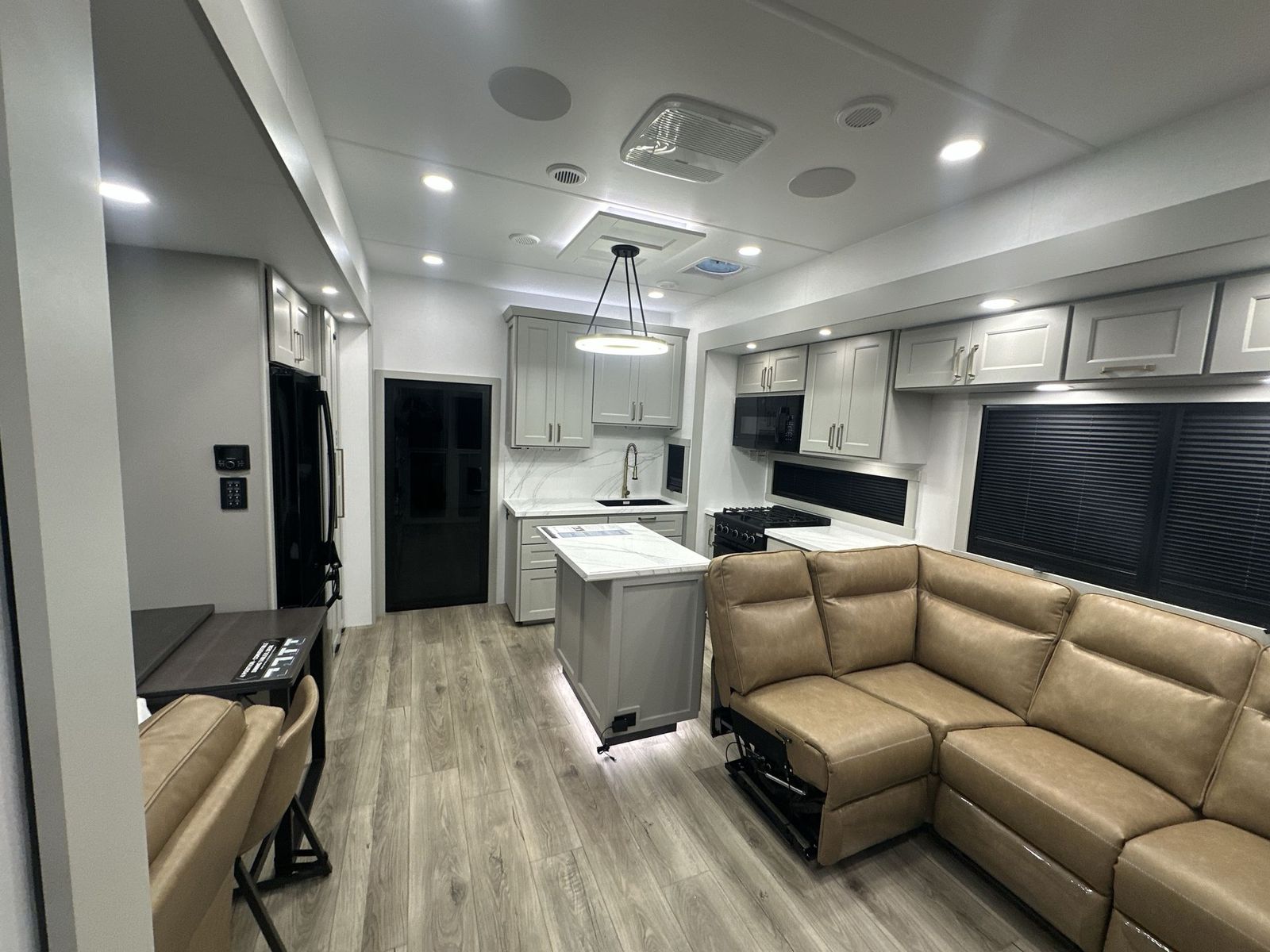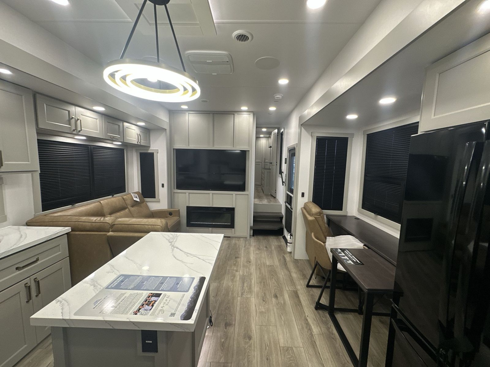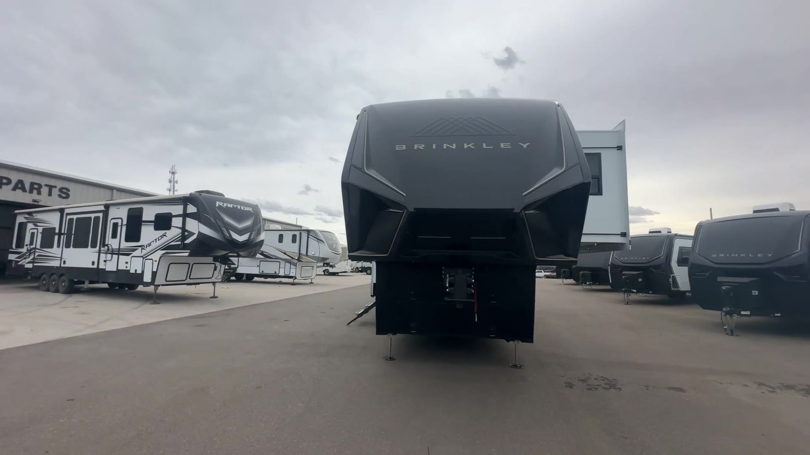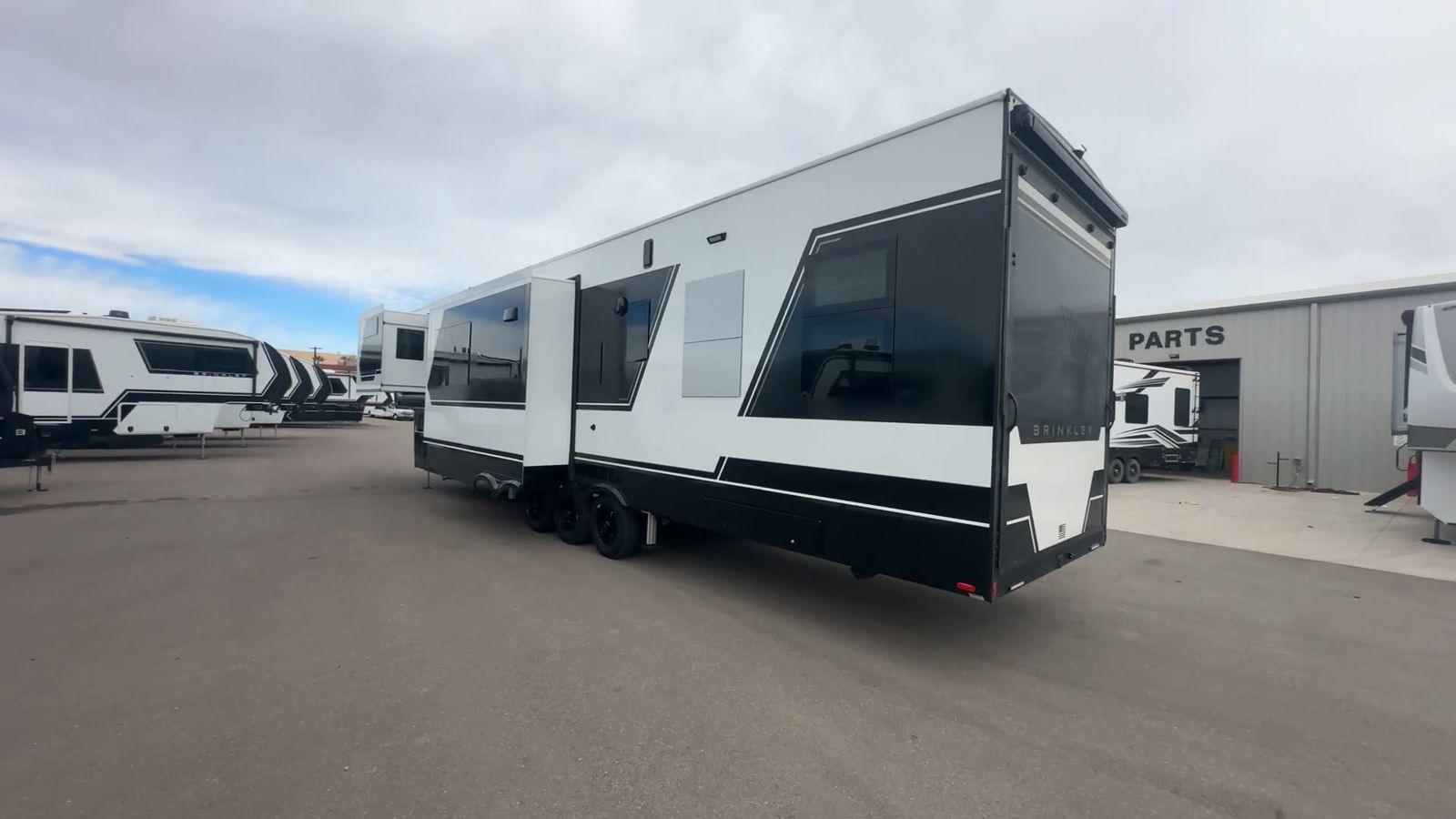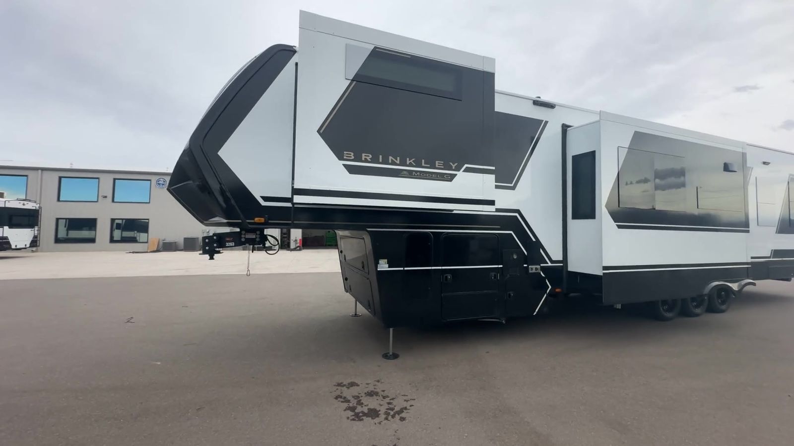 Brinkley Model G toy hauler 3950 highlights: 14' Garage with Loft L-Shaped Sofa 19 Cu. Ft. Refrigerator King Bed Slide Out Pull-Out Trash Bins Walk-In Bedroom Closet Bath and a Half This toy hauler may just be the one you've been looking for! The garage/flex space with fold-away half bath walls will allow you to utilize the garage how you need it, plus there is an adjustable tie-down system, independent dual sofas, plus a loft for storage and a twin bed to sleep more campers! The garage patio with a 1,500 lb. capacity is another feature you are sure to love, especially with its own awning to keep you protected from the elements. Head to the kitchen to prepare meals with a 24" GE oven with a four-burner range, a GE microwave with an air fryer, plus a spacious GE Energy Star 19 cu. ft. refrigerator. The island with two stools will let others visit with you while you cook, and there are even hidden dog bowls. You'll find the convertible dining table/L-desk will be accommodating since it can be used to dine at, and to get some work done. You may just find yourselves spending most of your time on the L-sofa in front of the TV and fireplace. A full bath is up front by the bedroom, and here you'll find neon shower lighting, a residential shower system, and pull-out linen storage to keep towels ready to use. After a day outdoors you'll love nothing more than coming back to your own bedroom with a king bed slide out, TV, a walk-in closet, and many more storage spaces. And we haven't even touched on the exterior features, like the 3-way pass-through storage, four power awnings, an air compressor to fill up tires, and the list goes on and on! With any Model G toy hauler fifth wheel by Brinkley you will enjoy luxurious amenities, tons of storage space, and innovative features that have been developed and tested in the real world. Durable construction includes an industry leading PDI process, an industry best insulation package, and reinforced and walkable slide roofs. Some of the exterior features you'll find are a 3-way pass-through with a multi-functional flip-up bulkhead wall, under I-beam storage, a MAX-Vision reverse lighting system, and a low-maintenance roof to name a few. A Rockford Fosgate audio system comes standard, along with a OneControl app system that lets you control your fifth wheel's functions right from your mobile device. You will find the solar system with a designated storage area to be ultra convenient, plus there is a FlexPower 5500 with a dual fuel inverter generator for all your power needs. Head inside to find a residential interior with Brinkley's CraftSense wood trim construction, floating entrance steps, integrated window screens and insulated blackout blinds, and residential solid surface countertops plus backsplash. You will also enjoy theneon shower lighting and recessed medicine cabinets in the bath, plus motion activated LED bed lights and dual bedside outlets in the bedroom. Choose a Model G toy hauler fifth wheel to experience all the luxury it has to offer!