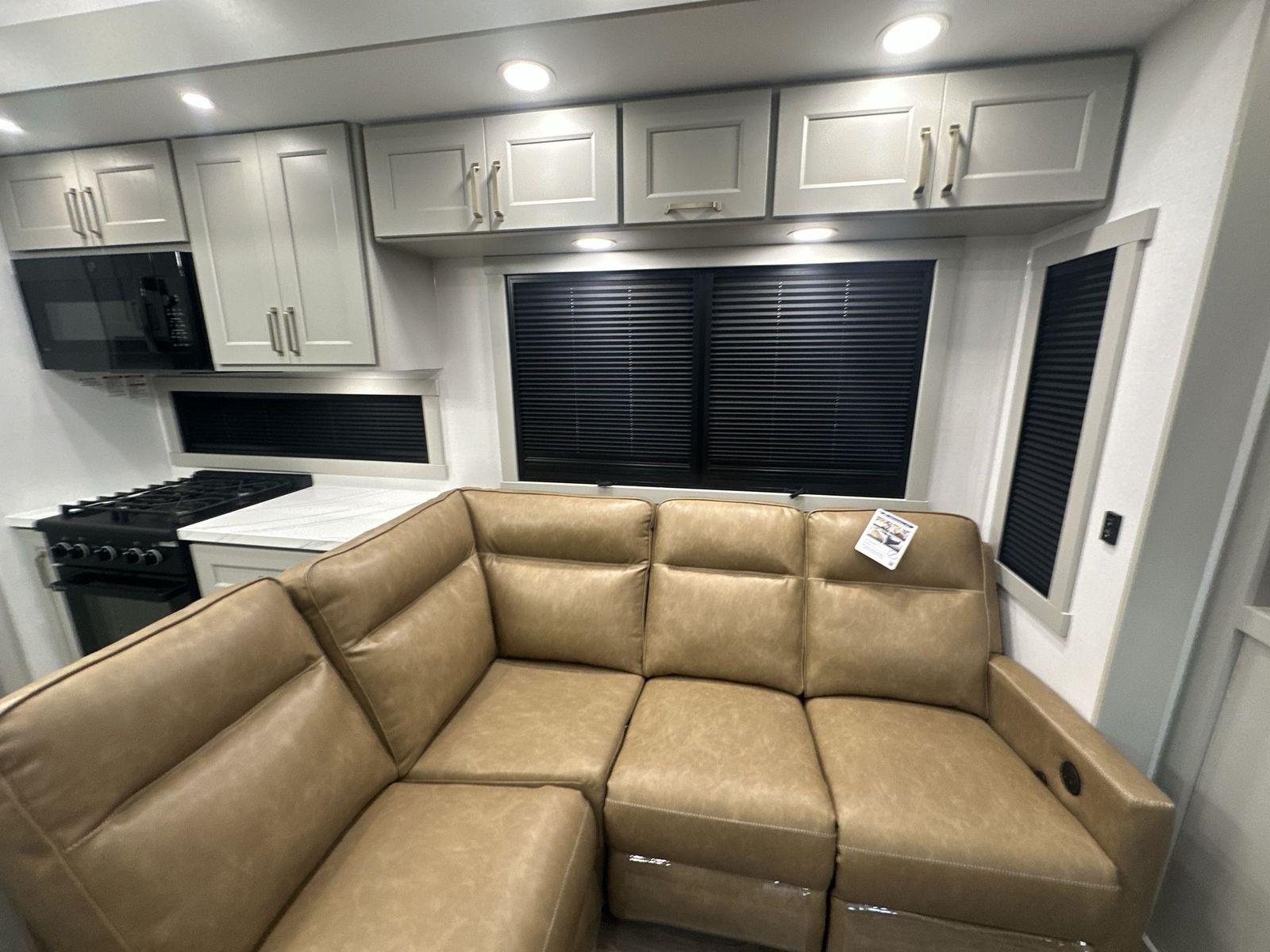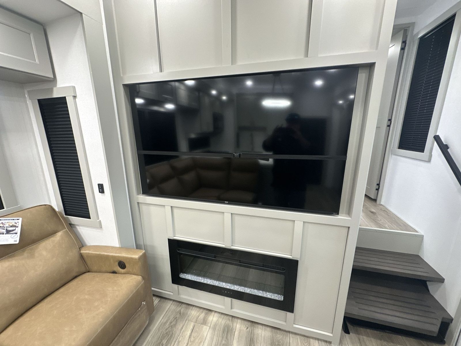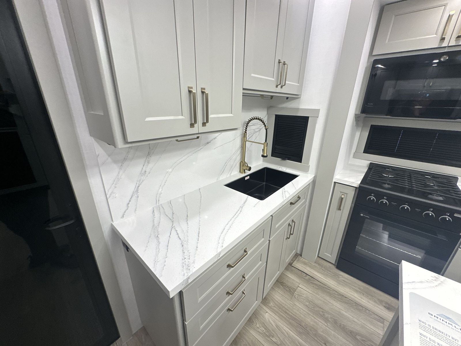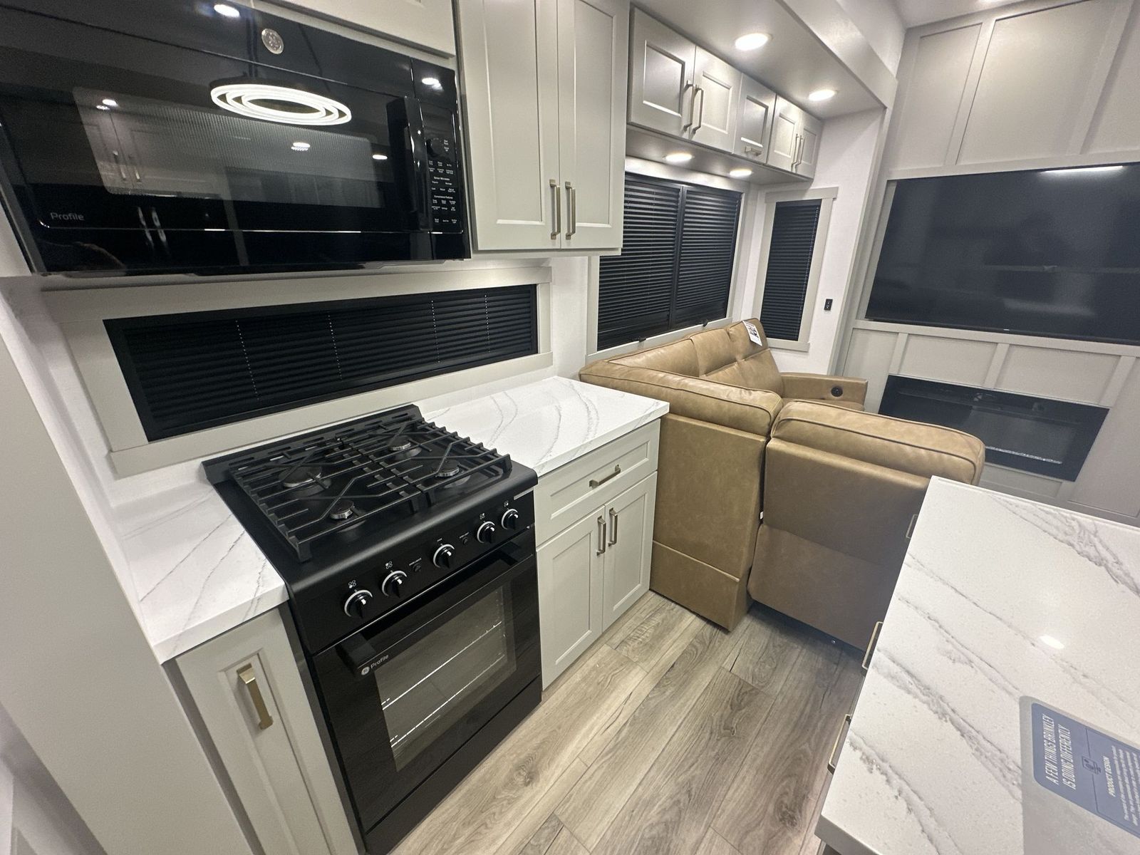 Brinkley Model G toy hauler 3950 highlights: 14' Garage with Loft L-Shaped Sofa 19 Cu. Ft. Refrigerator King Bed Slide Out Pull-Out Trash Bins Walk-In Bedroom Closet Bath and a Half This toy hauler may just be the one you've been looking for! The garage/flex space with fold-away half bath walls will allow you to utilize the garage how you need it, plus there is an adjustable tie-down system, independent dual sofas, plus a loft for storage and a twin bed to sleep more campers! The garage patio with a 1,500 lb. capacity is another feature you are sure to love, especially with its own awning to keep you protected from the elements. Head to the kitchen to prepare meals with a 24" GE oven with a four-burner range, a GE microwave with an air fryer, plus a spacious GE Energy Star 19 cu. ft. refrigerator. The island with two stools will let others visit with you while you cook, and there are even hidden dog bowls. You'll find the convertible dining table/L-desk will be accommodating since it can be used to dine at, and to get some work done. You may just find yourselves spending most of your time on the L-sofa in front of the TV and fireplace. A full bath is up front by the bedroom, and here you'll find neon shower lighting, a residential shower system, and pull-out linen storage to keep towels ready to use. After a day outdoors you'll love nothing more than coming back to your own bedroom with a king bed slide out, TV, a walk-in closet, and many more storage spaces. And we haven't even touched on the exterior features, like the 3-way pass-through storage, four power awnings, an air compressor to fill up tires, and the list goes on and on! With any Model G toy hauler fifth wheel by Brinkley you will enjoy luxurious amenities, tons of storage space, and innovative features that have been developed and tested in the real world. Durable construction includes an industry leading PDI process, an industry best insulation package, and reinforced and walkable slide roofs. Some of the exterior features you'll find are a 3-way pass-through with a multi-functional flip-up bulkhead wall, under I-beam storage, a MAX-Vision reverse lighting system, and a low-maintenance roof to name a few. A Rockford Fosgate audio system comes standard, along with a OneControl app system that lets you control your fifth wheel's functions right from your mobile device. You will find the solar system with a designated storage area to be ultra convenient, plus there is a FlexPower 5500 with a dual fuel inverter generator for all your power needs. Head inside to find a residential interior with Brinkley's CraftSense wood trim construction, floating entrance steps, integrated window screens and insulated blackout blinds, and residential solid surface countertops plus backsplash. You will also enjoy theneon shower lighting and recessed medicine cabinets in the bath, plus motion activated LED bed lights and dual bedside outlets in the bedroom. Choose a Model G toy hauler fifth wheel to experience all the luxury it has to offer!