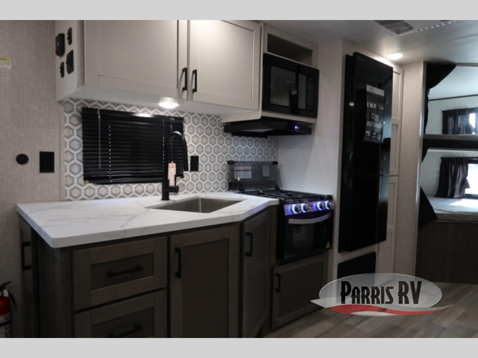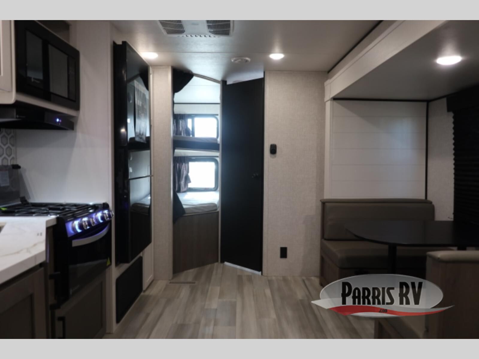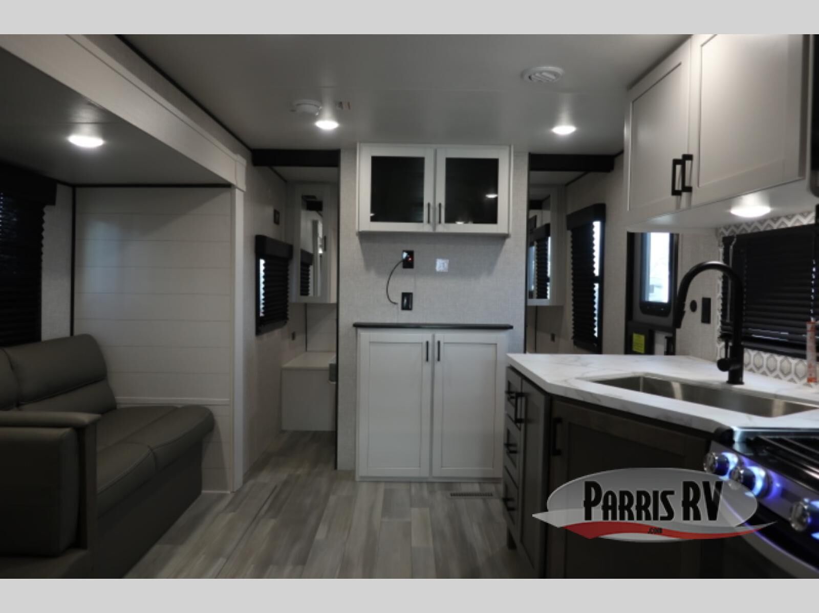 You're going to love every minute spent in this spacious travel trailer. The booth dinette and jack-knife sofa within the large slide out will be perfect for meal times, relaxing, and additional sleeping space. Add the optional Smart TV to the entertainment center and you're set up for movie night! This model includes an outside kitchen with a griddle and a refrigerator for cold drinks, plus indoor appliances if the rain has ruined your plans for the day. You will enjoy your own bedroom up front with space-saving sliding doors and two wardrobes for your clothes.