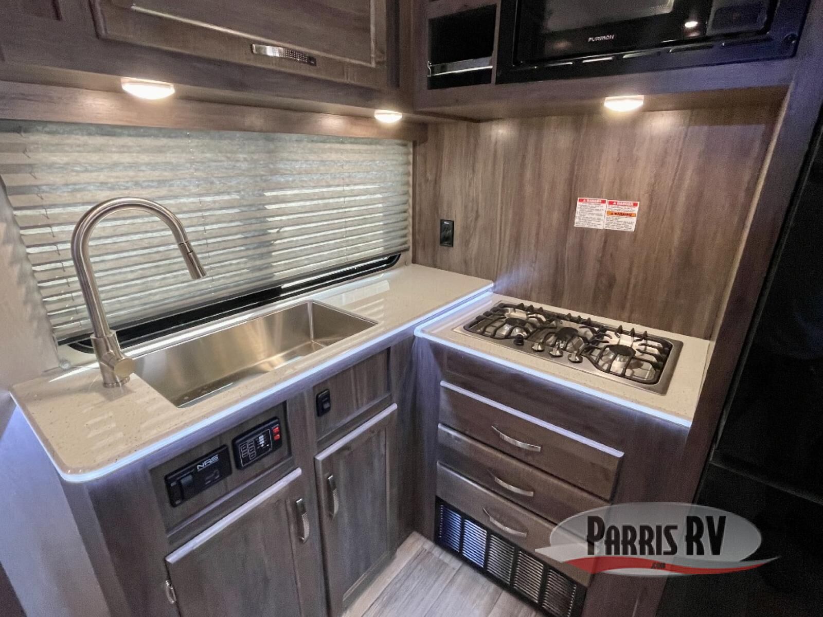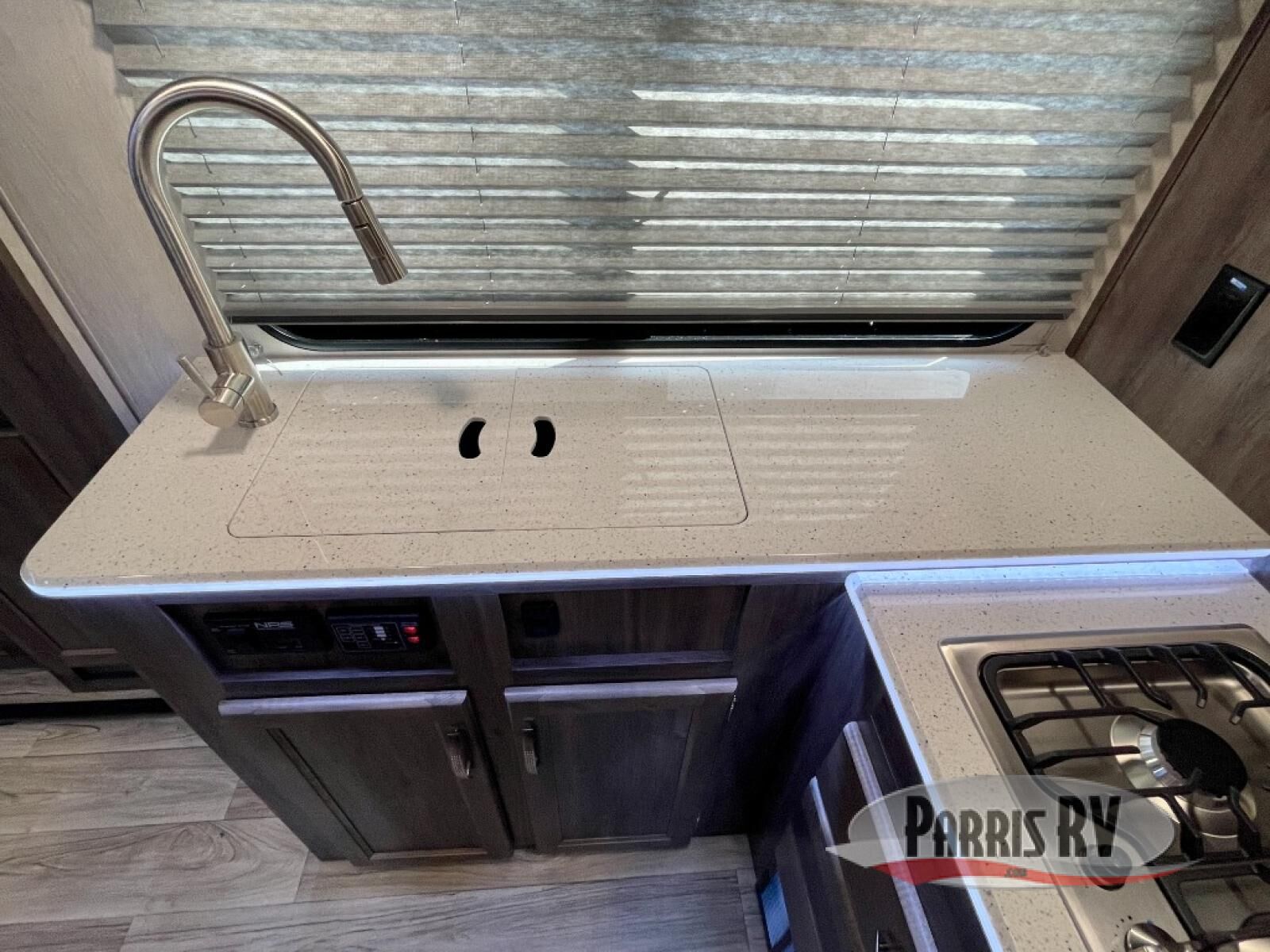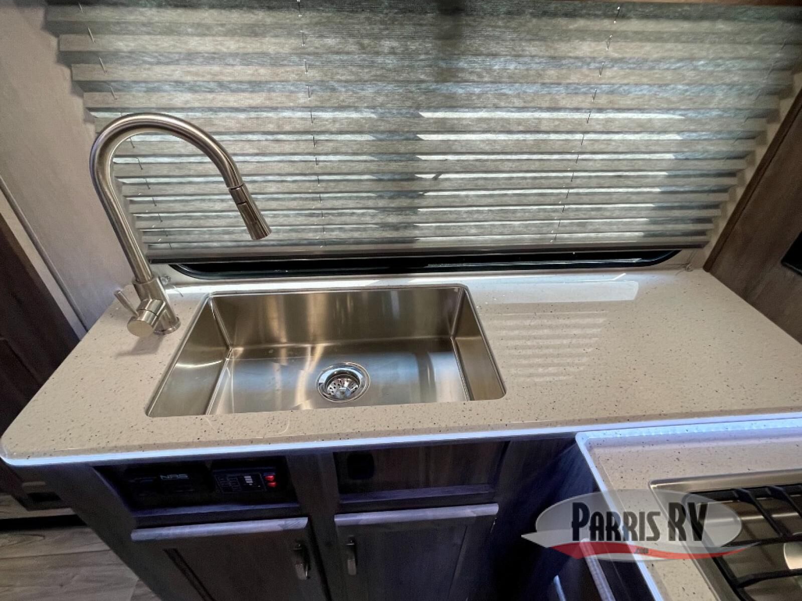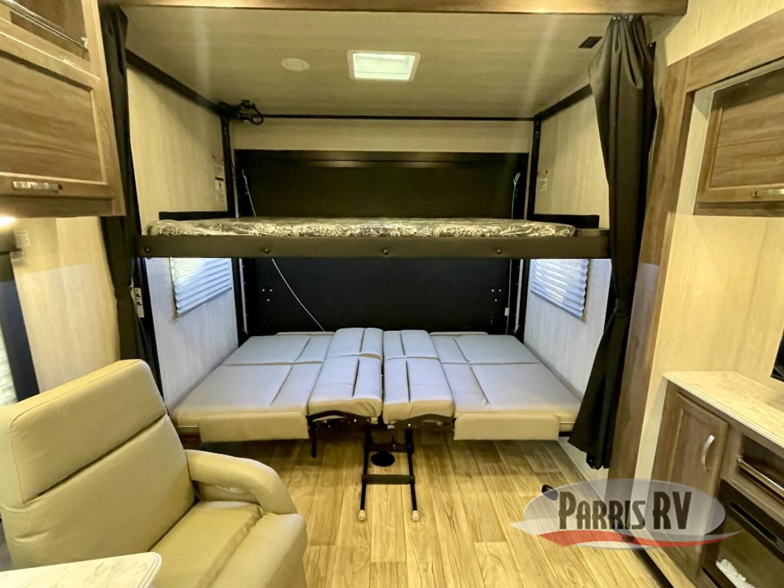 Load up the dirt bikes or kayaks and head for the campground in this toy hauler! After you've unloaded your toys using the 7' laminated ramp door, you can relax on the opposing rear power dinette or the dual swivel/rocker chairs. There is also a table and picture window here to enjoy great outdoor views. A 40" TV will keep you entertained and the full kitchen will let you make meals each day. The full bath is complete with a radius shower and skylight and a large metal sink with a stylish faucet. When you're ready for some shut-eye, the front bedroom with a queen bed will be waiting for you!