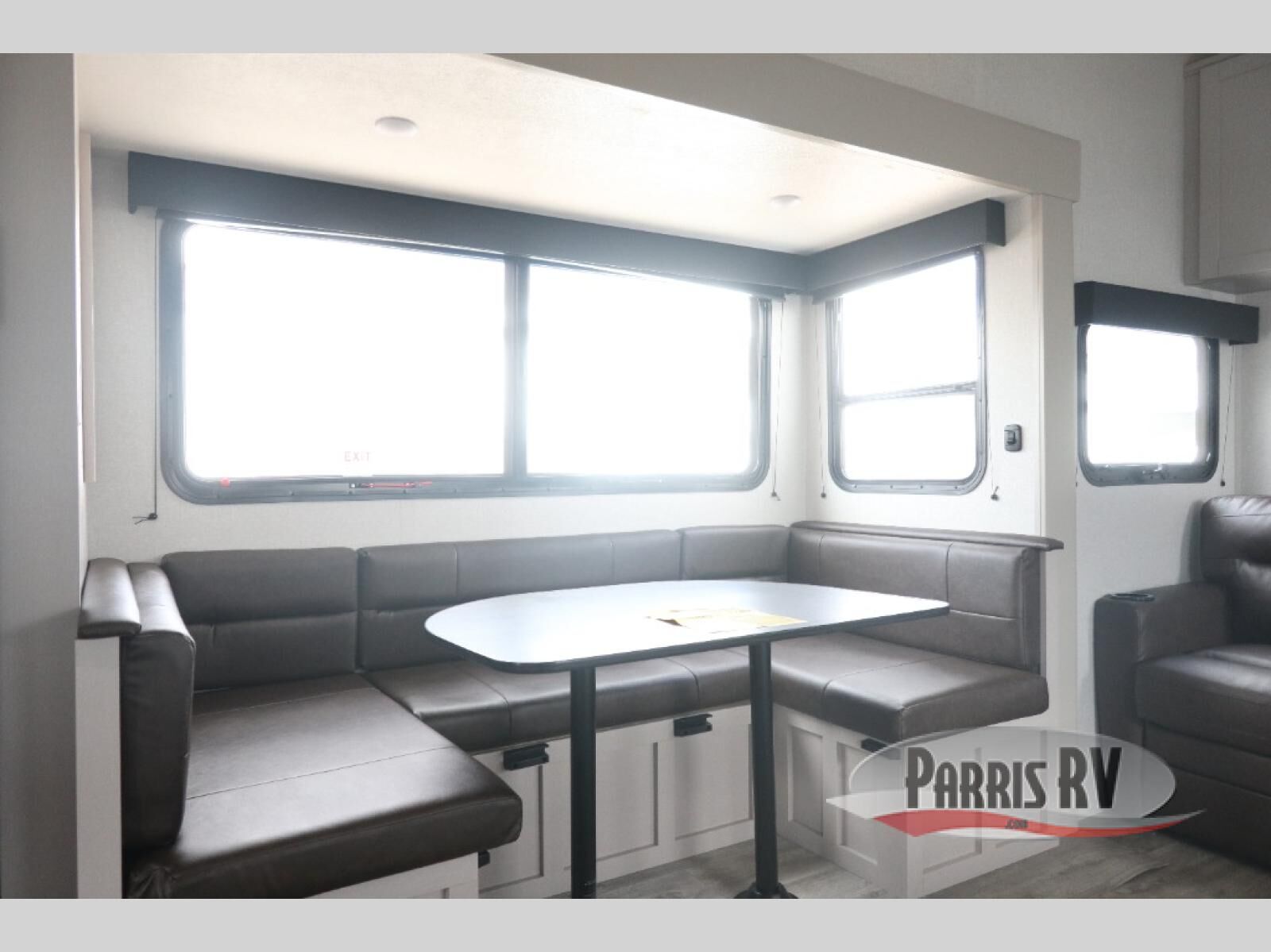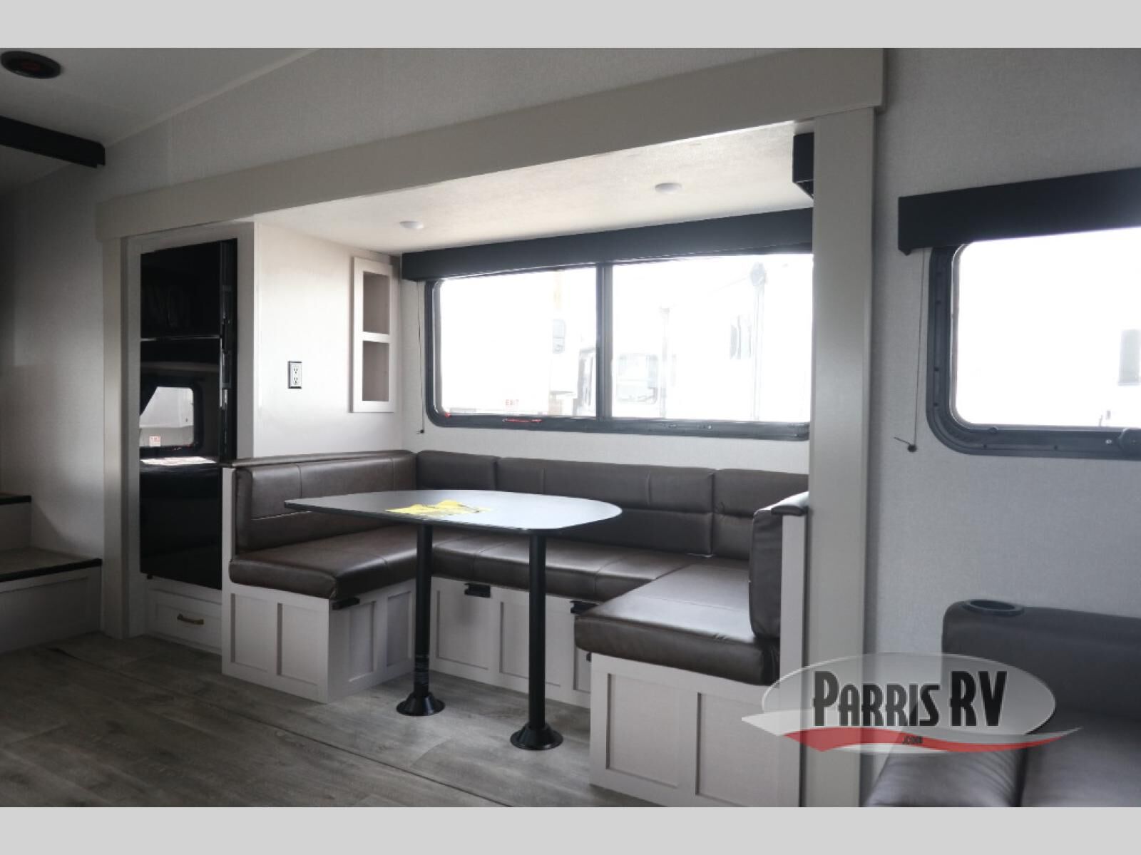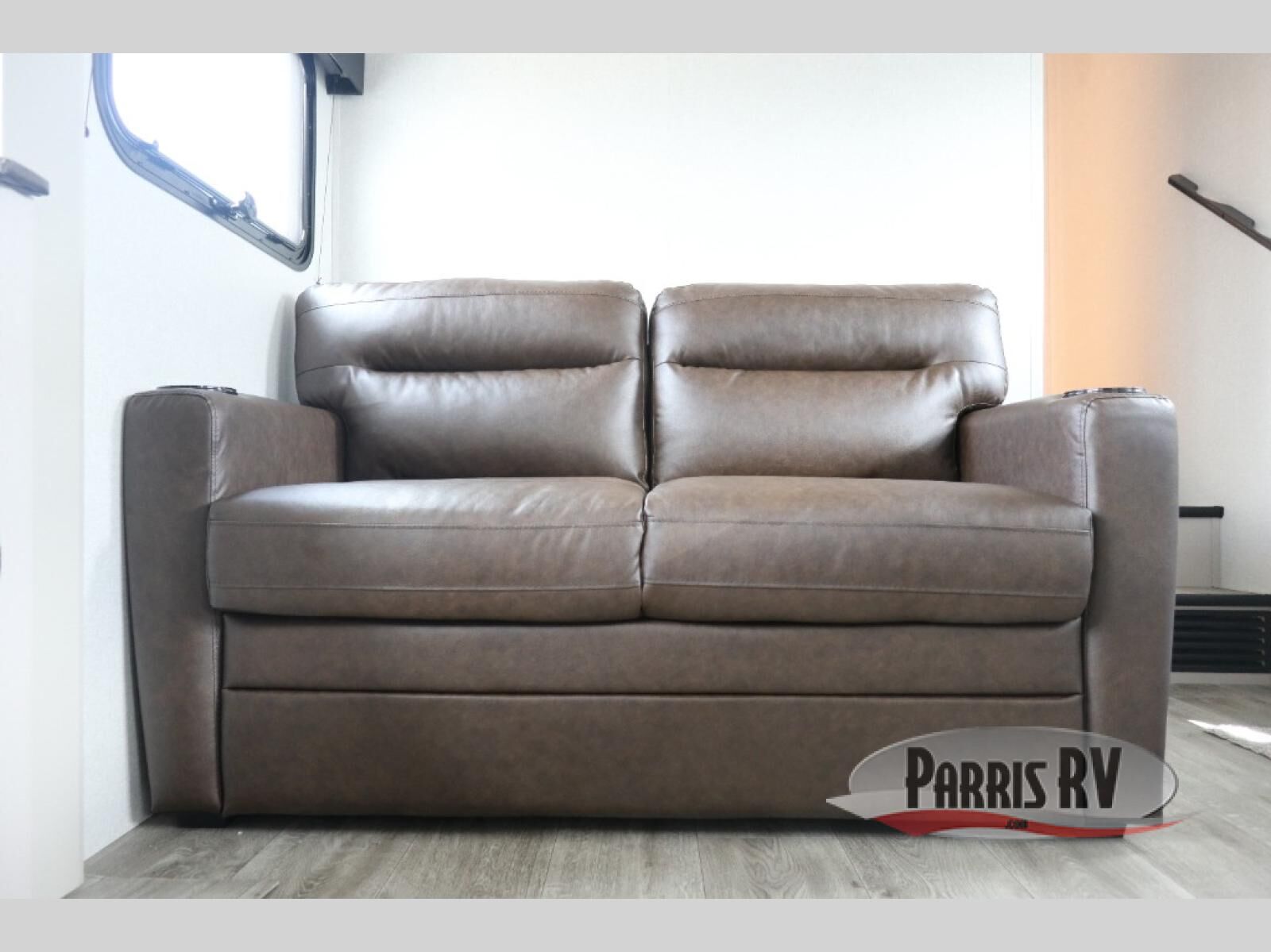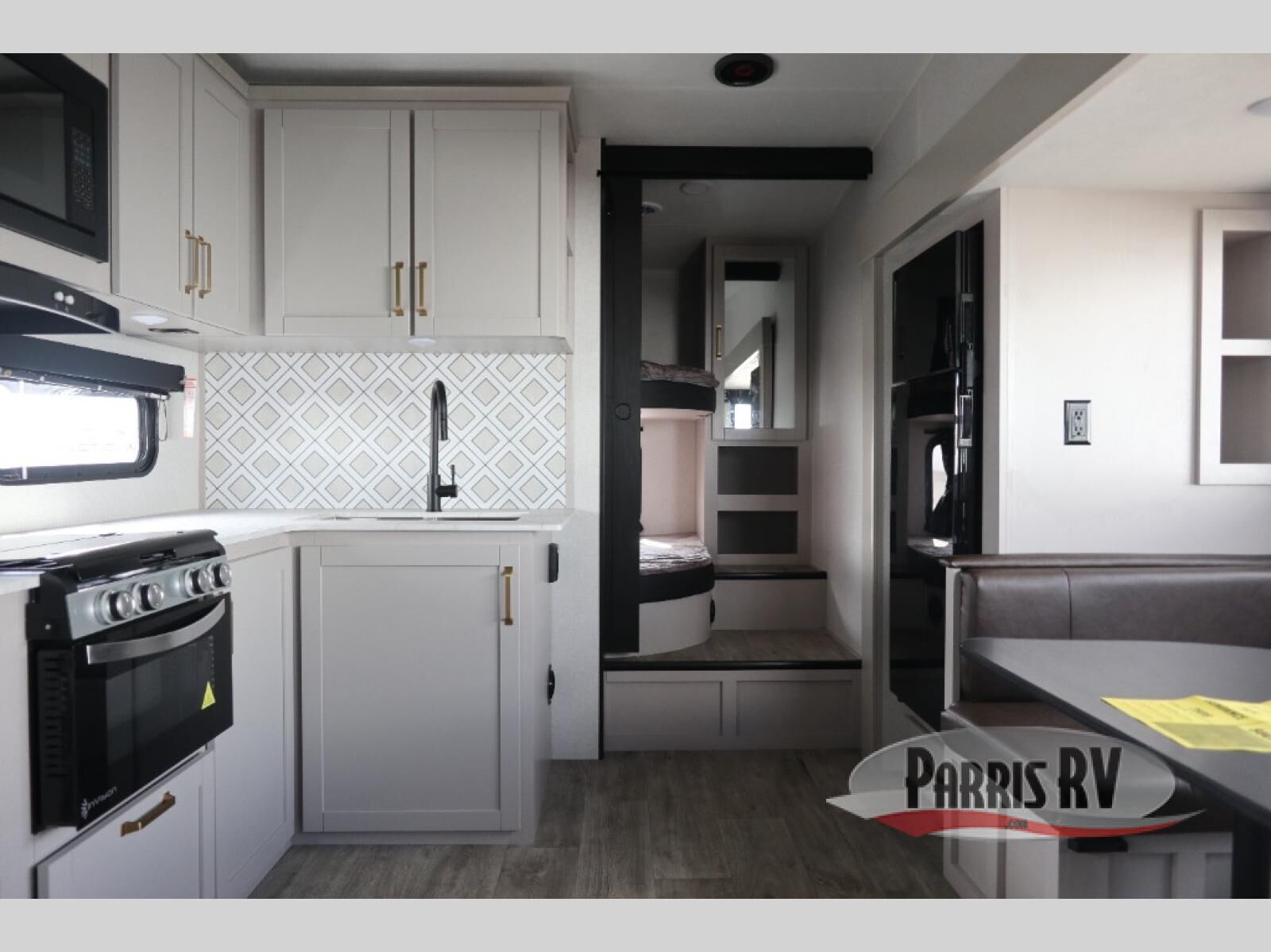 This fifth wheel's spacious interior boasts double-sized bunk beds designed for kids or guests, providing a comfortable sleeping space. A U-shaped dinette that offers ample seating and dining space for meals or even more sleeping space, as well as the 60" tri-fold sofa, which provides additional seating and can be converted into a comfortable sleeping area. In the kitchen area, you will find many amenities to cook delicious meals, such as a microwave, refrigerator, and overhead cabinets that will allow you to keep everything organized. The front bed is spacious, featuring a queen bed ideal for sleeping tight, and the full bath will complete the at-home experience since you will be able to take a refreshing shower on hot days!
