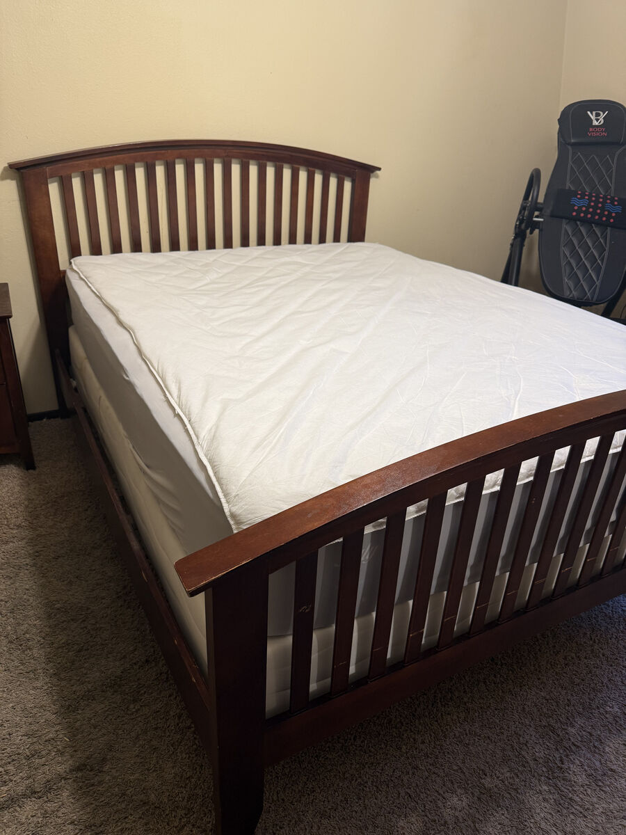 Queen Bed frame with Box Springs and Mattress. Some spilt chocolate shake on boxsprings. Asking $175 or Best Offer. Must come pickup, no deliveries. Sheets and pillows not included