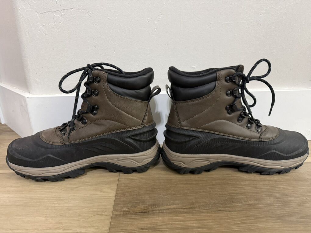 Men’s Size 8M (medium width) Warm and insulated Durable rubber sole for great traction Waterproof design Comfortable and supportive