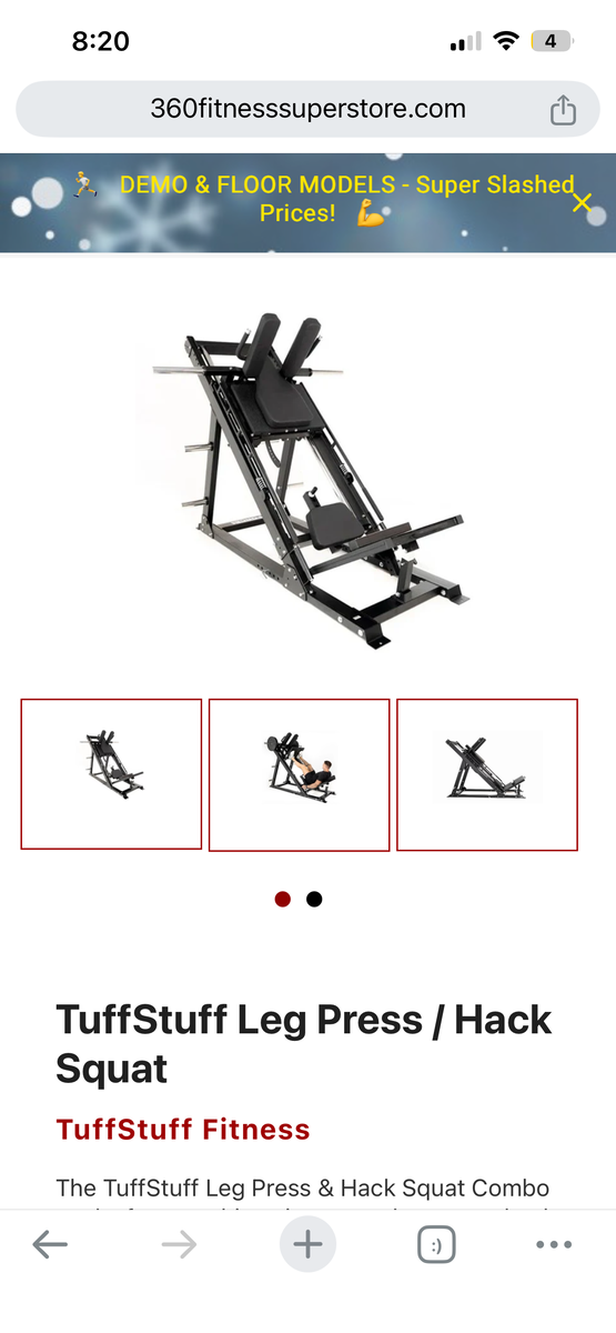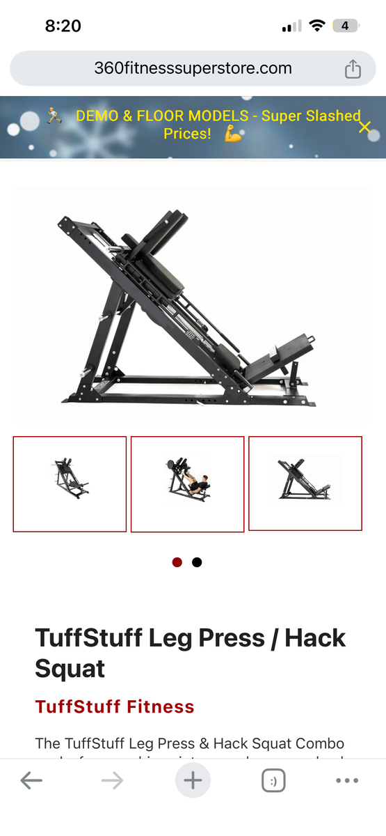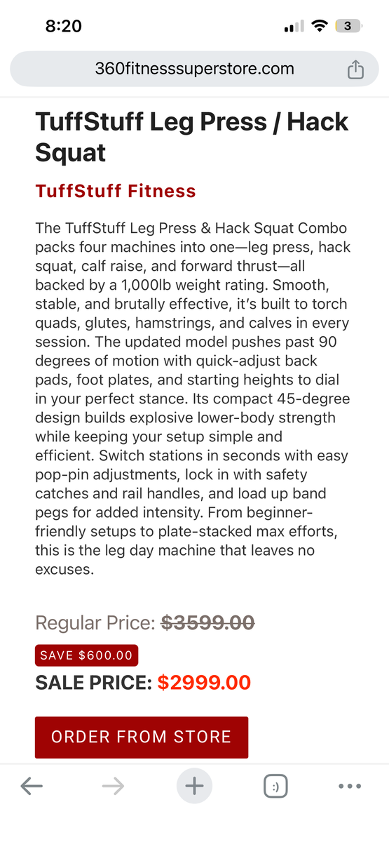 The TuffStuff Leg Press & Hack Squat Combo packs four machines into one-leg press, hack squat, calf raise, and forward thrust-all backed by a 1,000lb weight rating. Smooth, stable, and brutally effective, it's built to torch quads, glutes, hamstrings, and calves in every session. The updated model pushes past 90 degrees of motion with quick-adjust back pads, foot plates, and starting heights to dial in your perfect stance. Its compact 45-degree design builds explosive lower-body strength while keeping your setup simple and efficient. Switch stations in seconds with easy pop-pin adjustments, lock in with safety catches and rail handles, and load up band pegs for added intensity. From beginner-friendly setups to plate-stacked max efforts, this is the leg day machine that leaves no excuses.