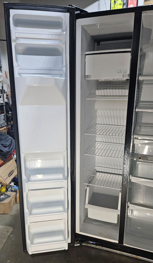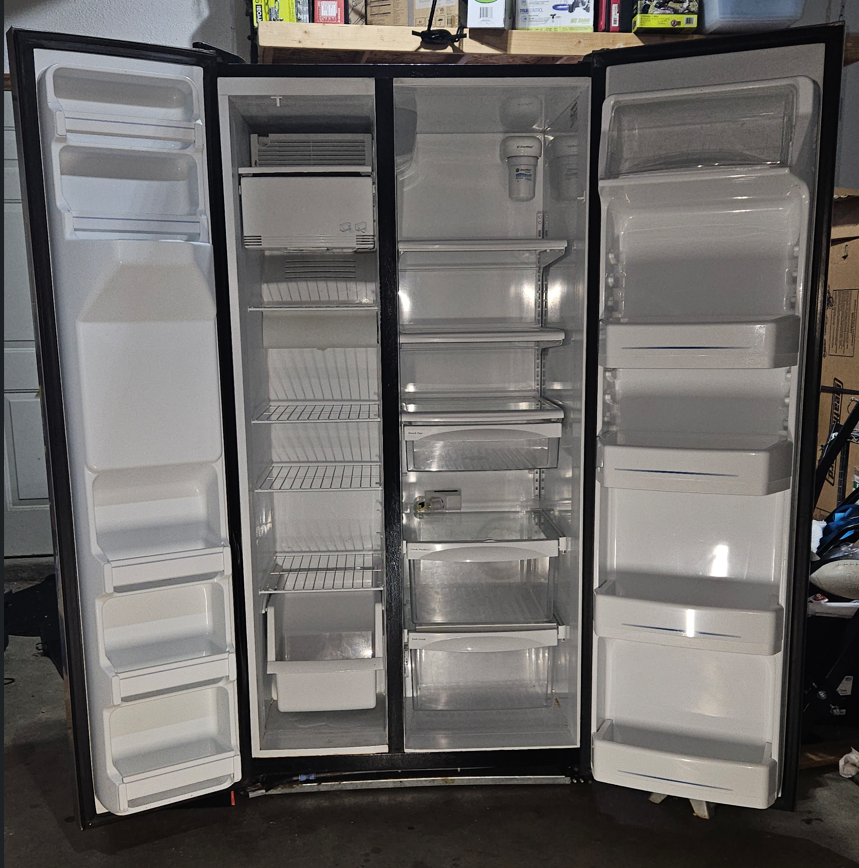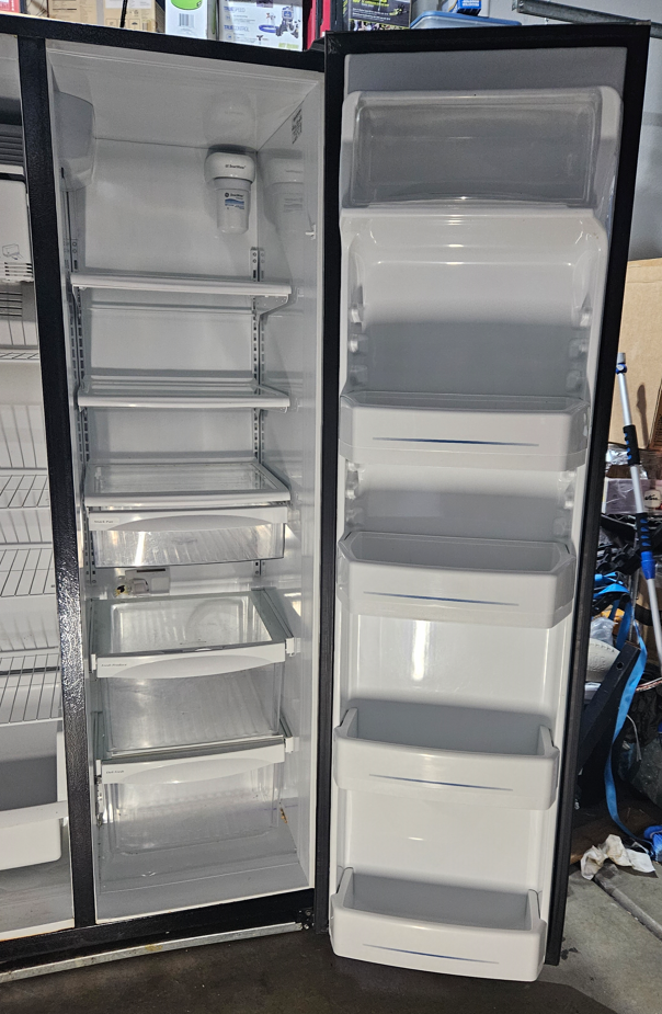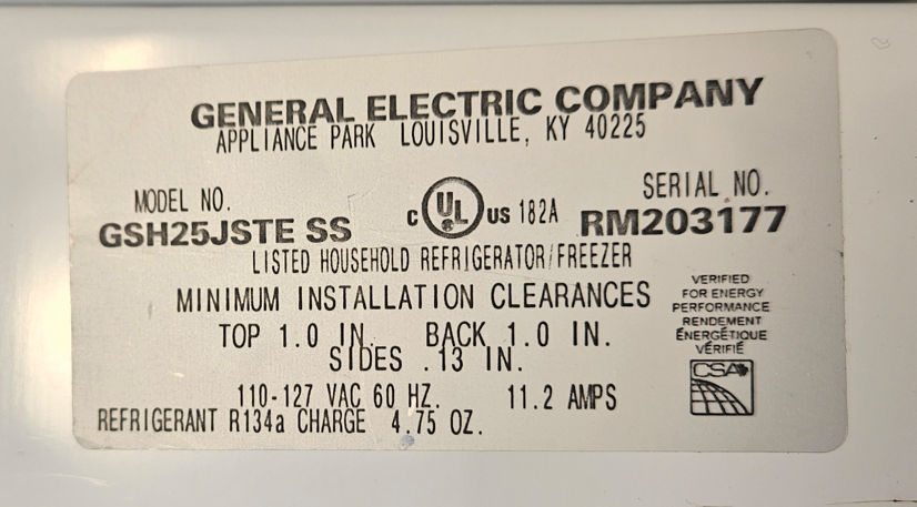 ZelleStainless steel GE side-by-side refrigerator, model GSH25JSTE. It is 25 cubic feet, and includes an ice maker and water dispenser. Everything is in great working condition. All trays and drawers are in very good condition. Recently replaced the defrost heater and control board. It's been running perfectly in my garage for the past 2 months.