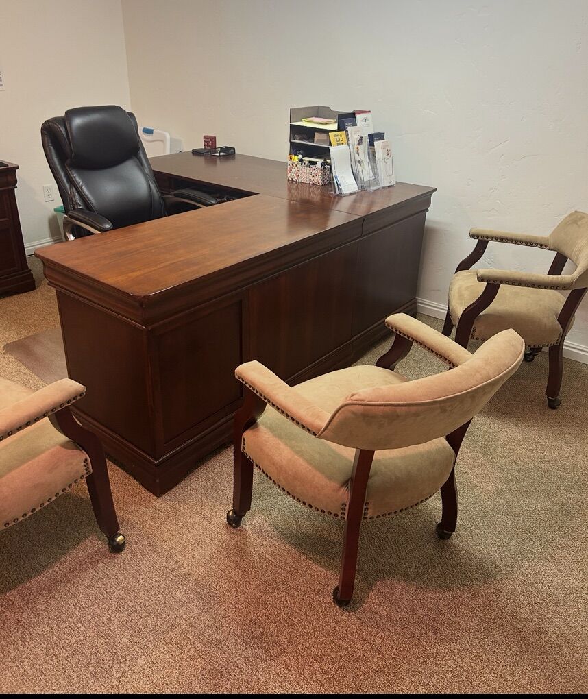 VenmoBeautiful, high-quality executive office furniture set featuring an L-shaped desk, three matching upholstered chairs, and a large file cabinet. This set is perfect for a professional office, home office, or client-facing workspace.