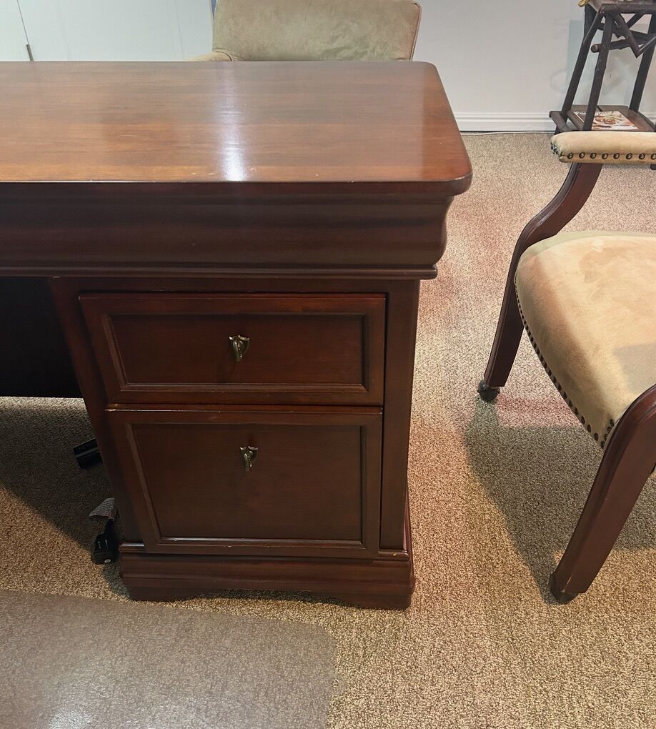The furniture showcases a rich cherry or mahogany-style wood finish with classic detailing and solid construction, offering both elegance and durability. The spacious desk provides plenty of workspace, while the matching file cabinet offers ample storage for documents and files. $575.00 OBO