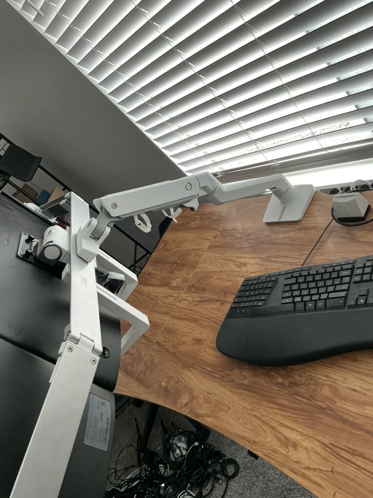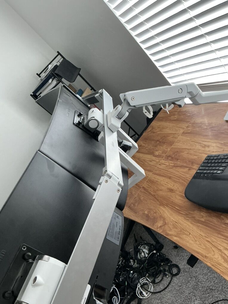 The ERGOTRON mount alone is a premium brand system (these run several hundred dollars new). It keeps everything perfectly aligned and frees up desk space for a clean, professional look.