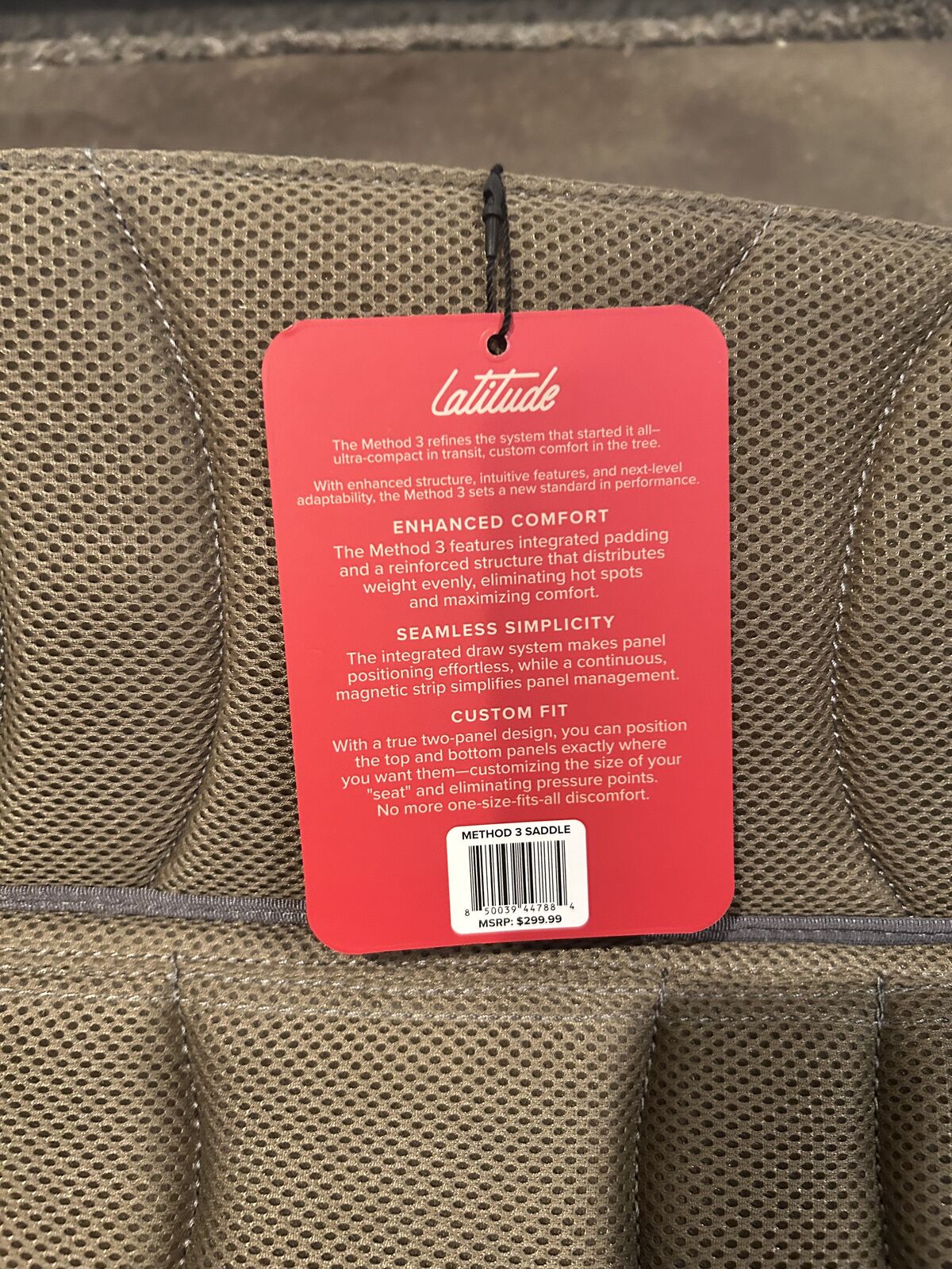 ZelleNew with tags Latitude Method 3 saddle hunting saddle. Brand new, never used, still has original tags attached. We have multiple available. Sells for $300 online so grab this new saddle here for less!