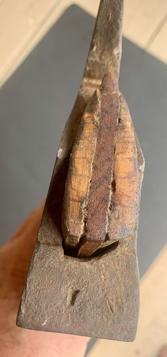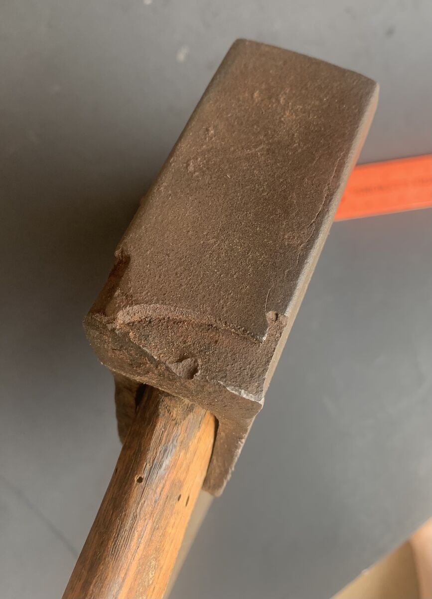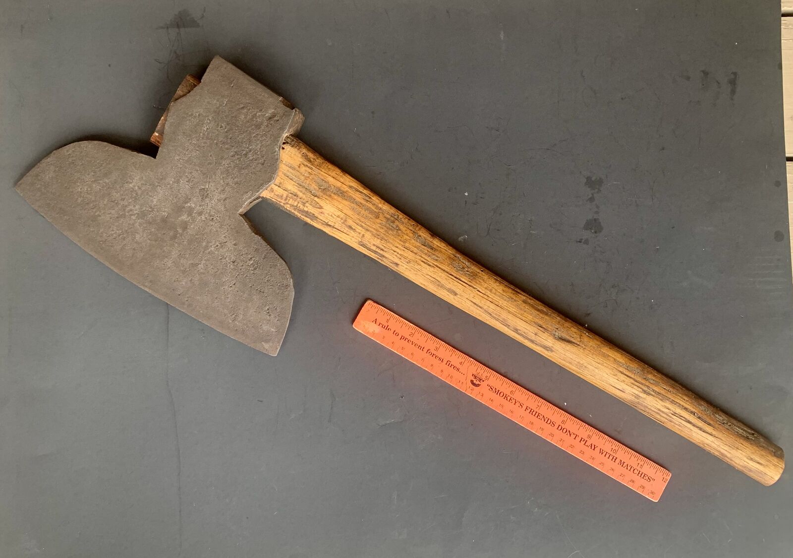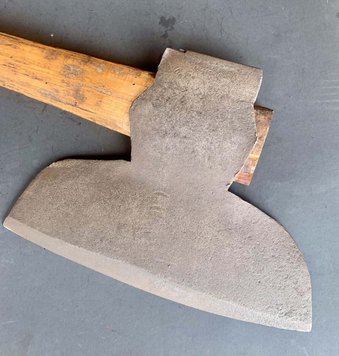 CashAppAntique single bevel broad axe from Isiah Blood, Ballston, NY. Between 125 and 140 years old. These were made for hewing a flat on a log and not for chopping. Total weight is 7 lbs 5 oz. Cutting edge almost 11”. Some damage to poll (back of head). A great user or wall hanger.