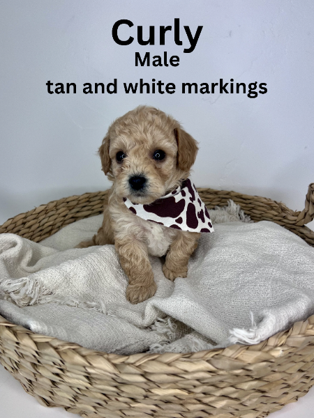 Curly - Wavy tan male with white markings. The most chill and timid of the siblings, you can hold him in any position and he doesn't care. We expect him to be pretty mellow.