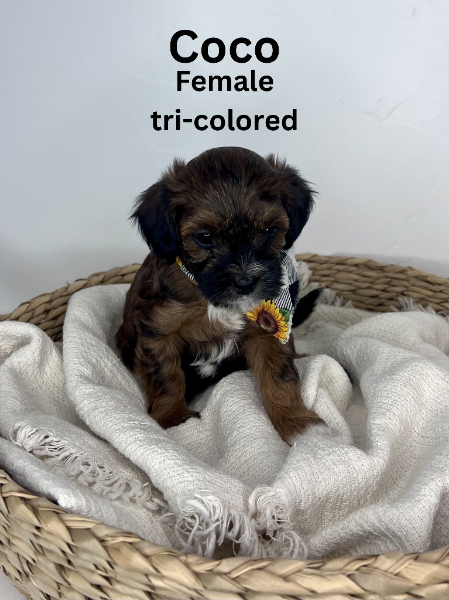 Coco - Tri-colored female. Sweet as chocolate, this little girl is one of the cuddliest of the litter. Her tri-color coat makes her absolutely adorable.