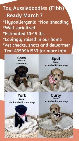 PayPalWe have four beautiful F1BB Aussie Doodle puppies looking for loving families! Ready to go March 7. These sweet pups are a perfect mix of intelligence, loyalty, and playful charm. They love people, playing, and curling up on your lap. They are expected to be around 10 pounds full-grown.