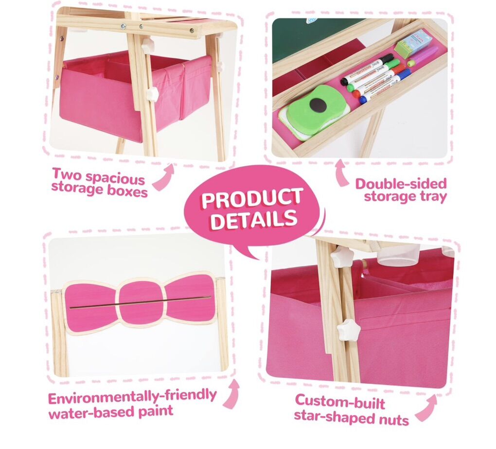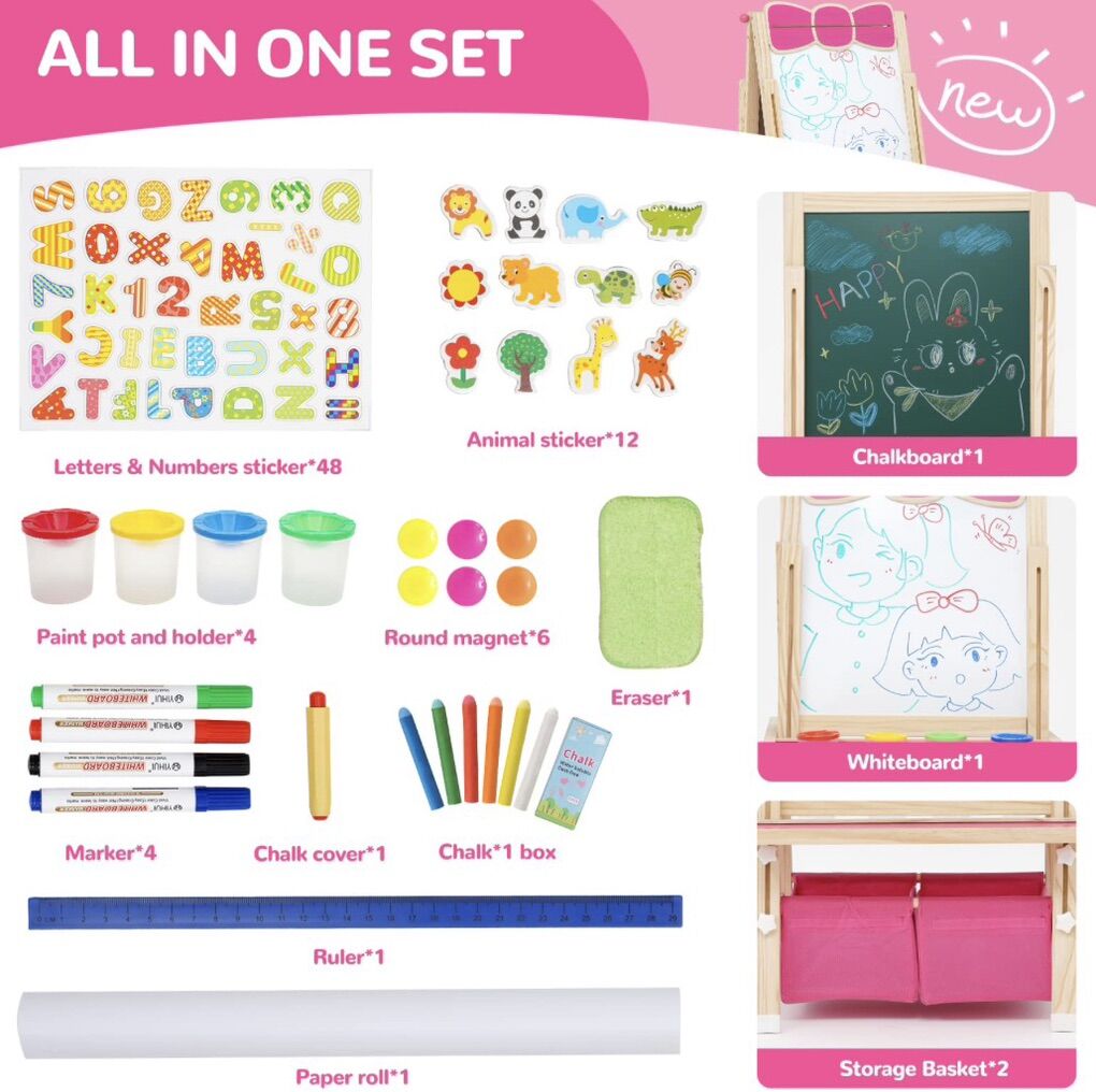 ZelleKids Wooden Easel, All-in-one Toddlers Easel Double Sided Standing Whiteboard Blackboard Children Art Easel with Storage, Height Adjustable Pink Drawing Board for Girls Painting and Writing