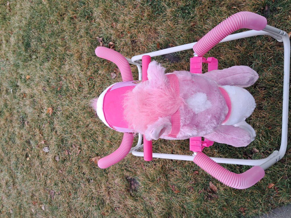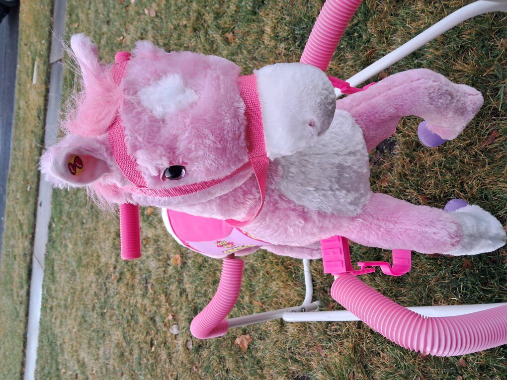 A ride on toy that sings and neighs.