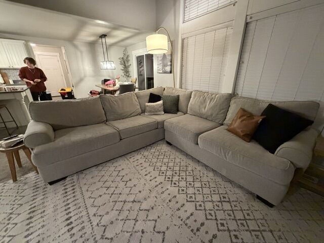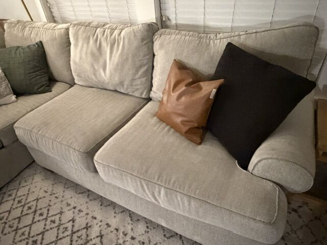 ZellePillows not included. A spring is broken in the large sofa but could be fixed by someone handy. The smaller couch is in great condition. There are a few blemishes shown in pictures that could be treated. We have not attempted to spot clean them so I'm pretty sure they can be removed.