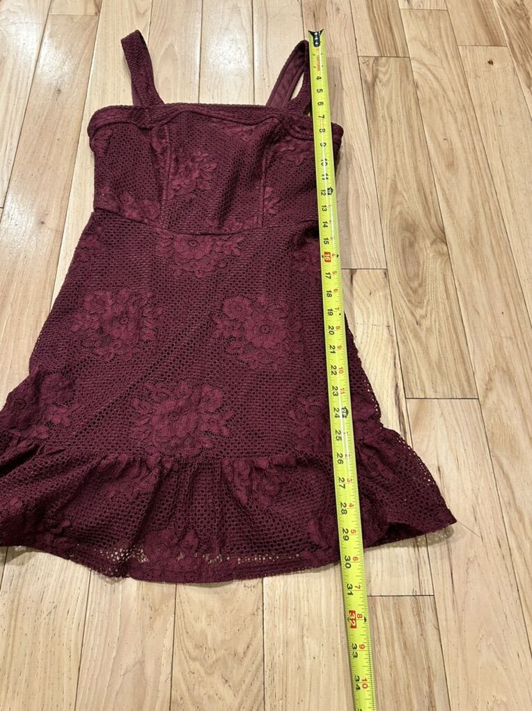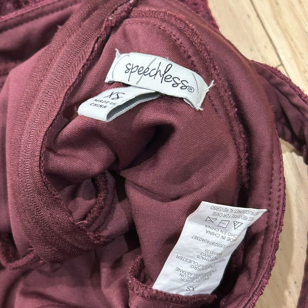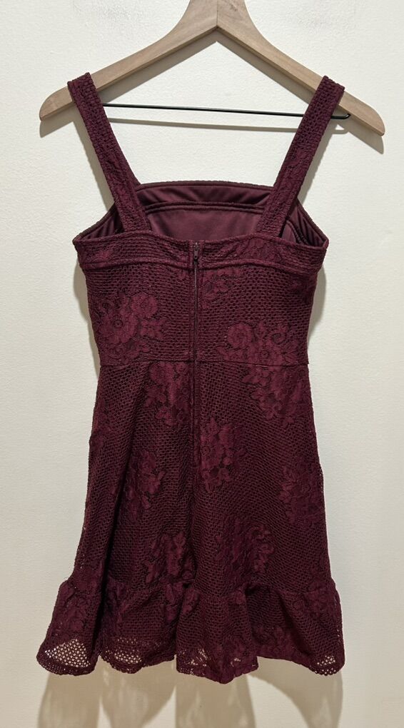 Speechless Burgundy Maroon (dark red/purple) Floral Lace Overlay Outer Layer Sundress - Women’s Size XS - with bottom hem ruffle - sleeveless with back zipper closure - rounded neck line - great condition - pre-owned.