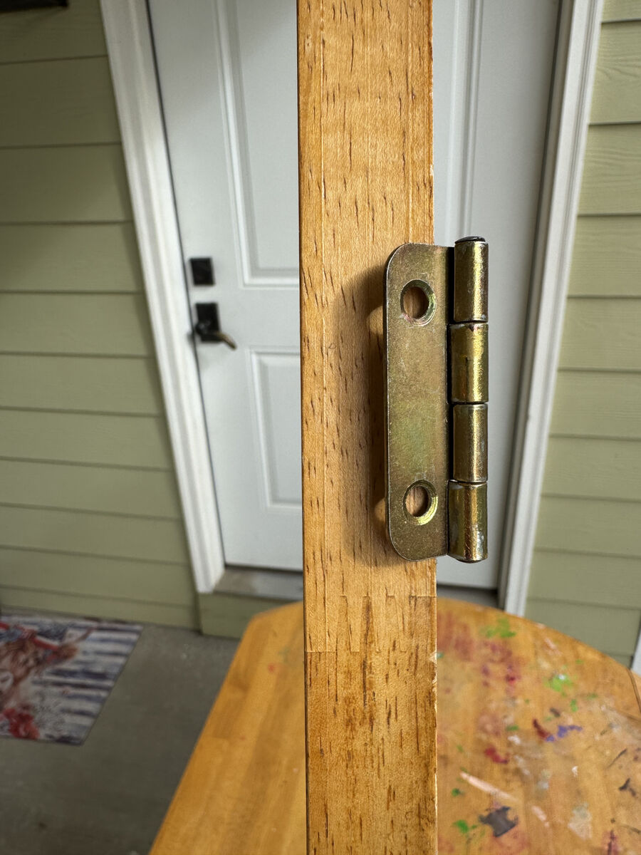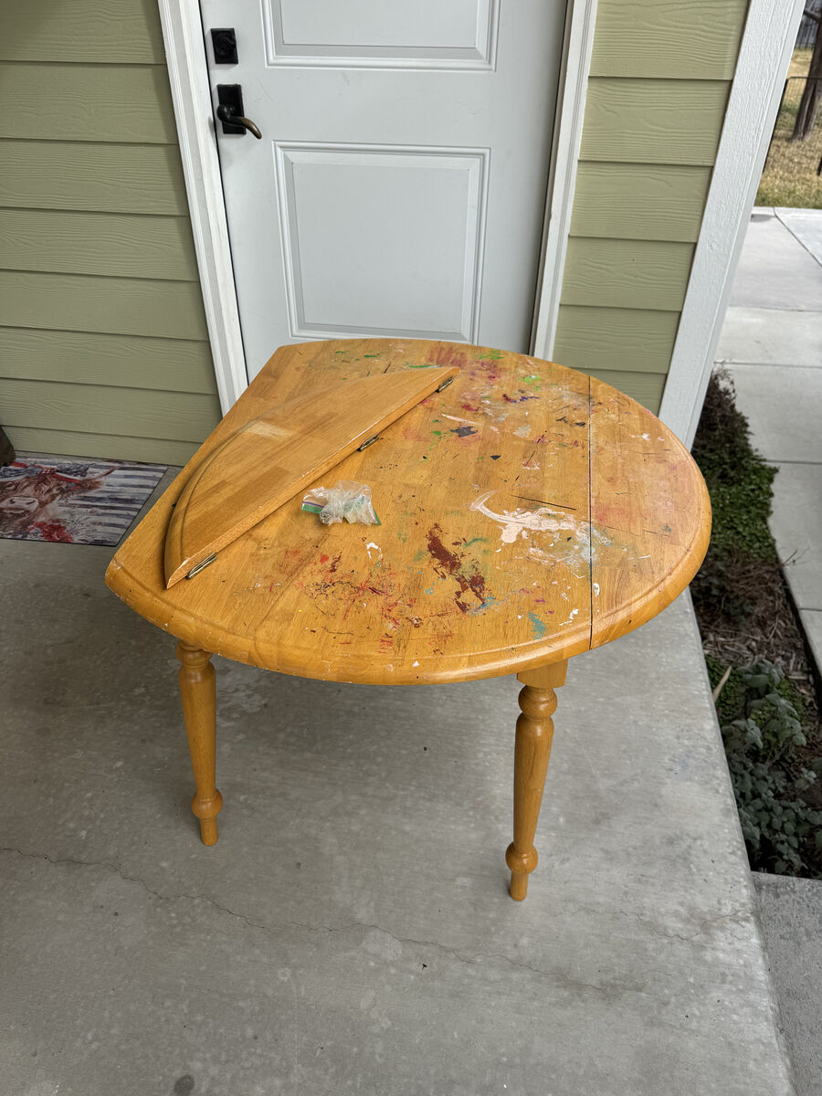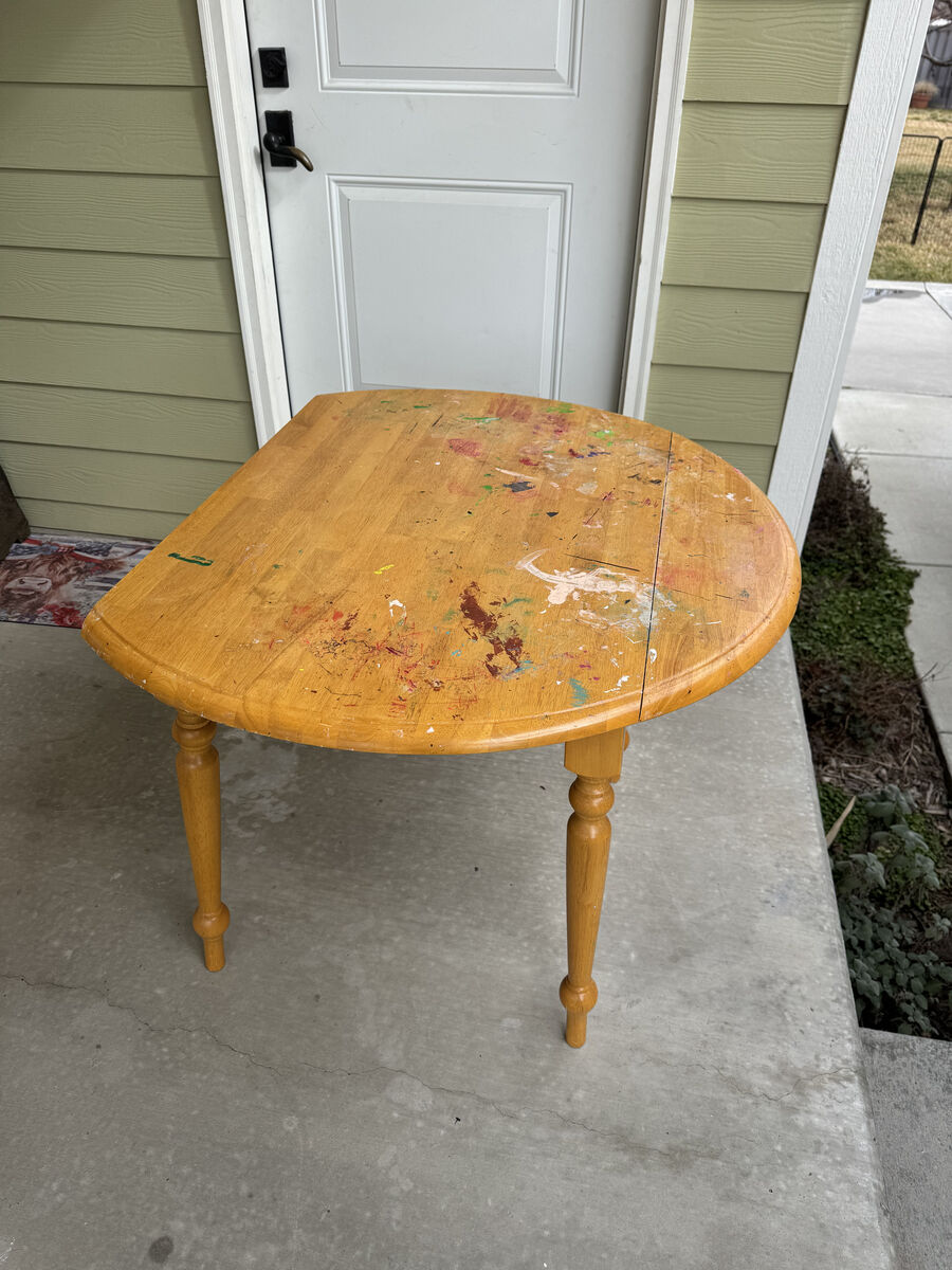 Wooden table with three chairs. Collapsable ends seen in photos. Table was used as an art table but can be resufaced as it is solid wood and not veneer. The table and chairs are fully functional.