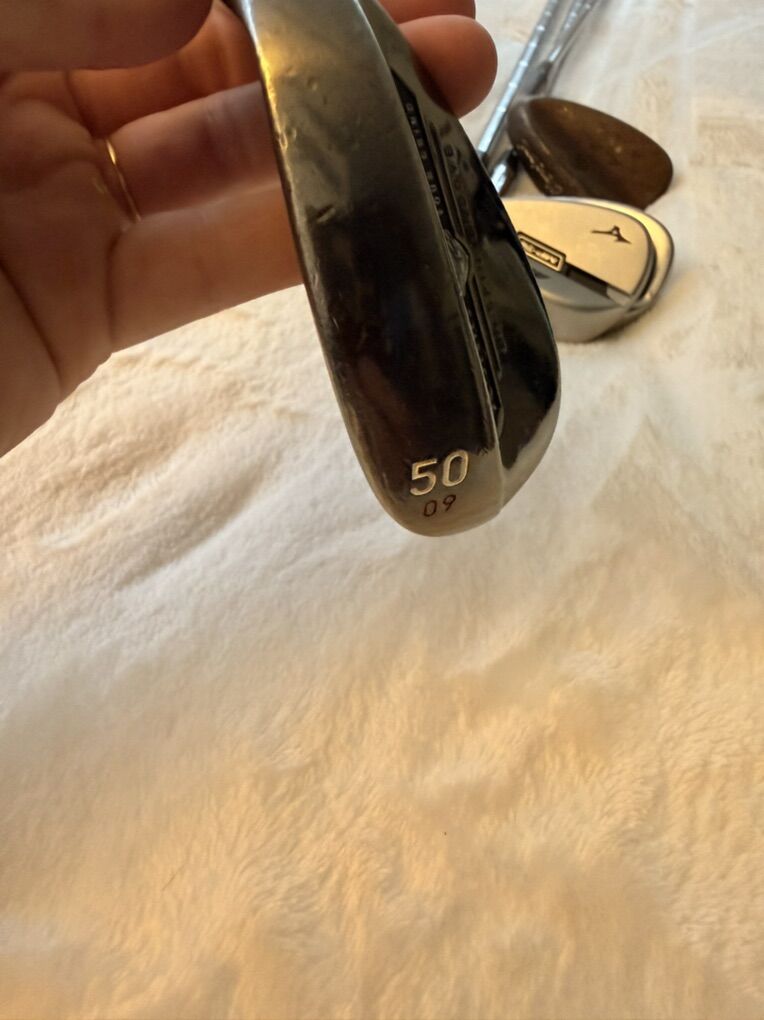 $20-Mizuno 50*06 is an MP-T4 with quad cut grooves and the classic Muzzy grain flow forged head. This gap wedge is buttery smooth and the original True Temper spinner shaft will help get a very responsive launch (typically mid to lower trajectory with the ability to generate lots of spin if desired). Brand new grip and there is some face/chrome wear, but lots of life left!!!