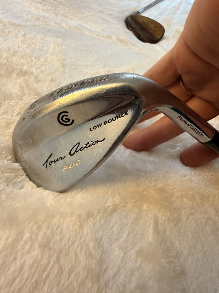 $20-Cleveland 56Low bounce(typically 6) Tour Action 900 sand wedge with a form forged chrome head. The shaft is the original True Temper/Cleveland wedge shaft and very good Lamkin crossline grip. Again, there is some face/chrome wear, but there is years of life left in this sand wedge. Very smooth, responsive and classic both in looks and feel!