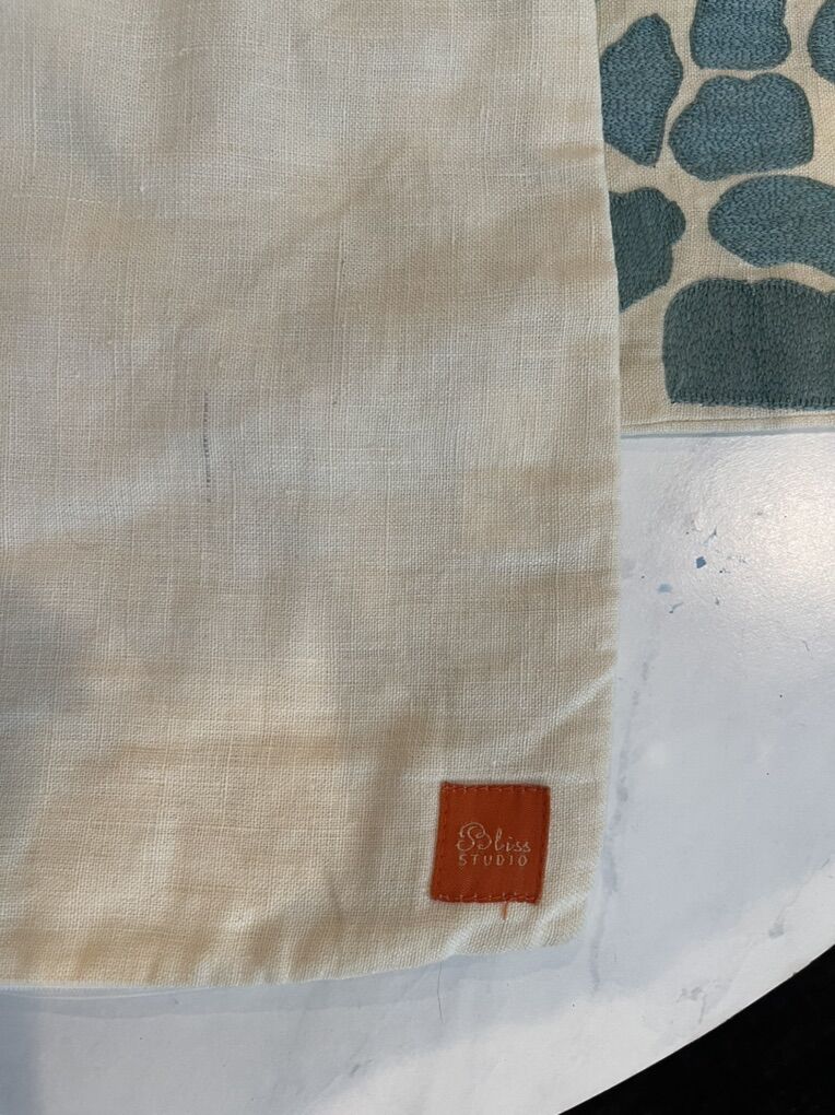 Large 23” x 23” size with a detailed embroidered pattern in a teal/neutral color palette — perfect for living room sofas, beds, or accent chairs. High-quality textile with a linen backing.