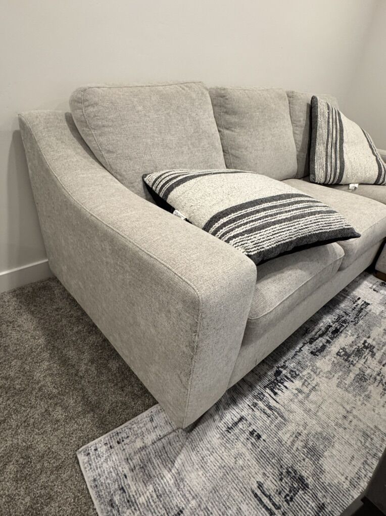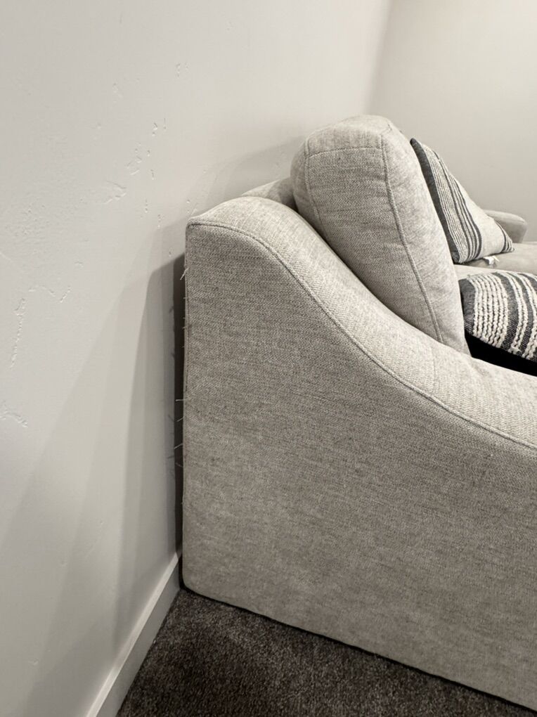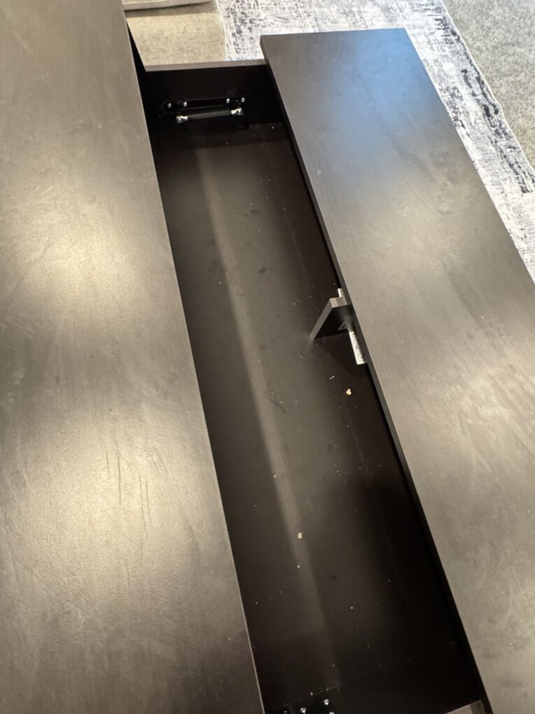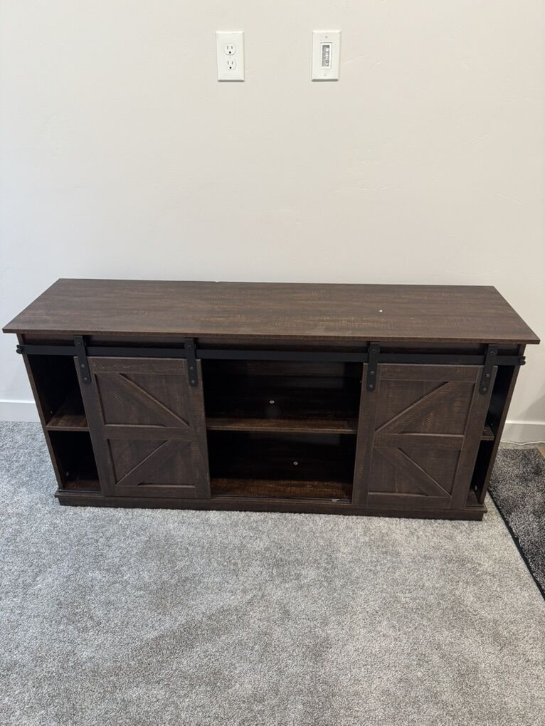 Full entertainment center, couch, soft close coffee table and rug Couch has some damage on the sides from cats scratching it, Entertainment center has a dent in it but could be filled or cover