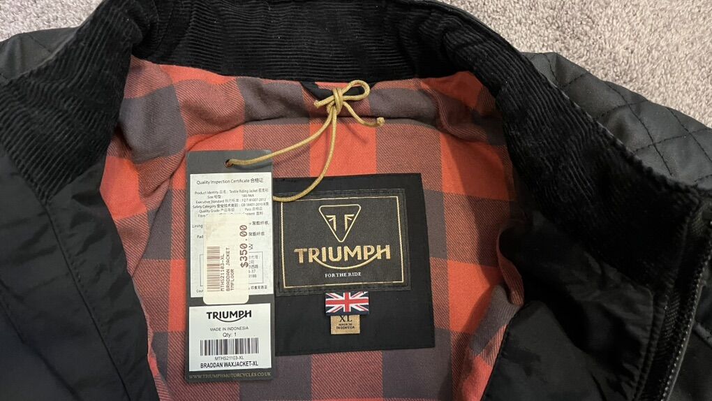 New with tags Triumph Braddan Jacket. Classic English wax cotton motorcycle jacket. Elbow & shoulder armor. Size XL. $225 obo