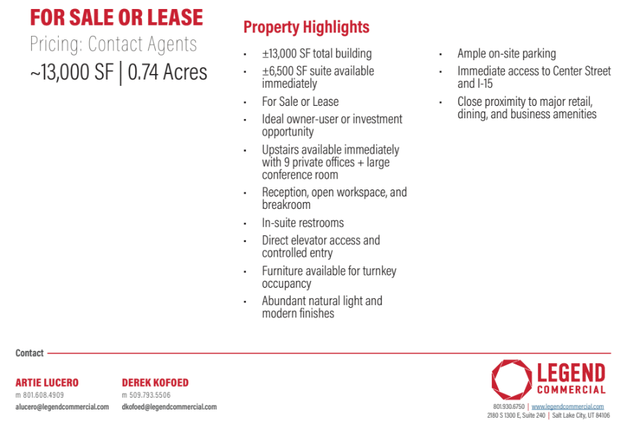 Very well built and located office project. 13,000 SF building, the bottom floor currently has tenants with the whole top floor available for a buyer to use or lease. Making it a great owner/user purchase. Call for more details or to tour.