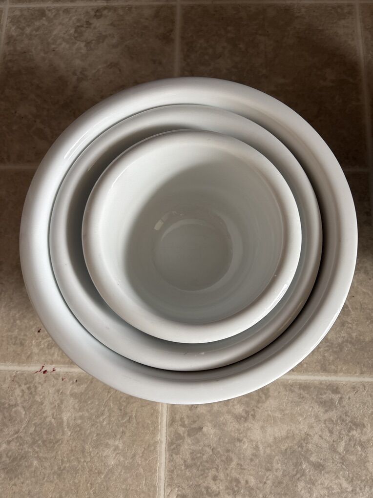 ZelleSet of three white ceramic mixing bowls in different sizes.