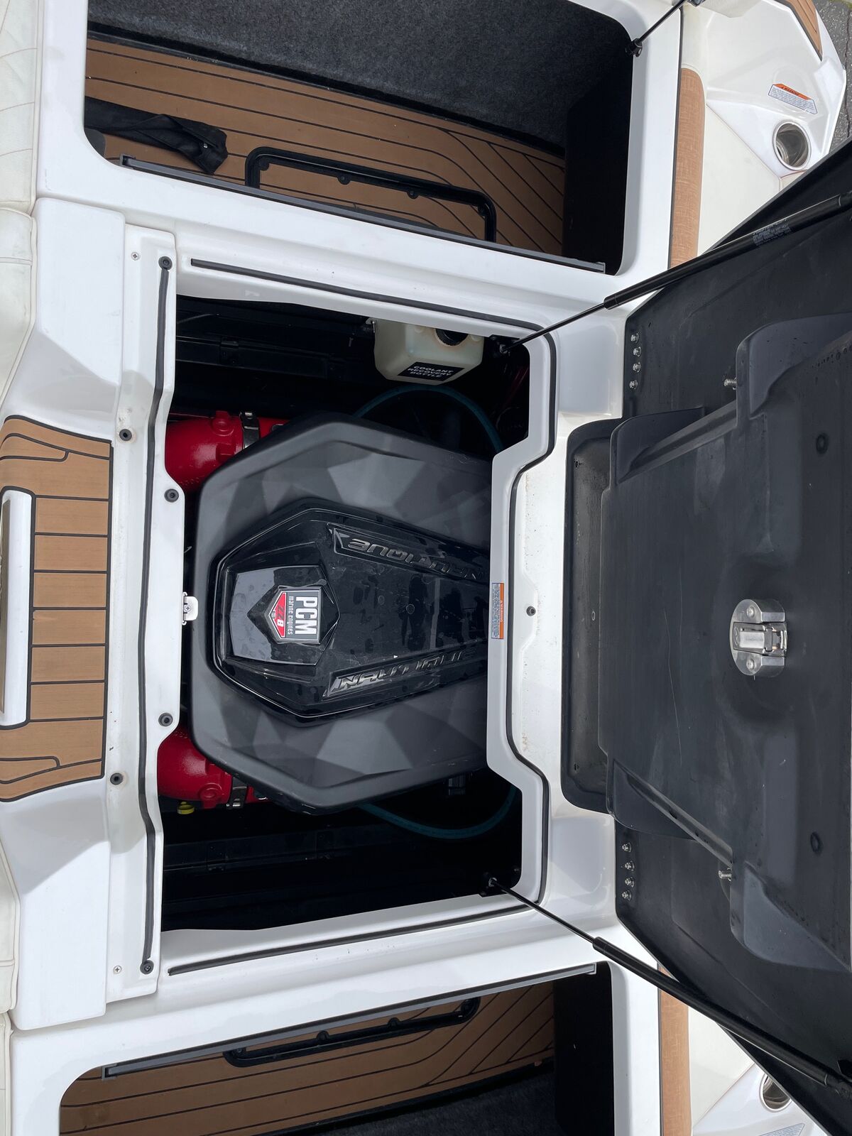Check out this nicely loaded 2021 Nautique G25. With almost every box checked from the factory this boat will produce great times on the water. RGB Lighting, Bimini w/Surf Pockets, Forward/Aft Sun Shades, Strapless Board Racks, Two Pair Tower Speakers, Tower Speaker Covers, GPS Mapping, Battery Charger, Platform Cover, Tower Up Cover, GoPro Transom Mounts, Heater, Swim Platform Ladder, Underwater Lights, Steering Assist, Phender Pro, Surf Select, Table, Leather Wrap Steering Wheel, Actuated Captain Chair, Bow Armrests, Bow filler Cushion, Wavefront Stereo Upgrade, Transom Stereo Controller and a Pocket Air Dam Door. Yes, every box check all the way down to the PCM ZZ8 600HP SuperCharged Power Plant with only 109 HOURS.