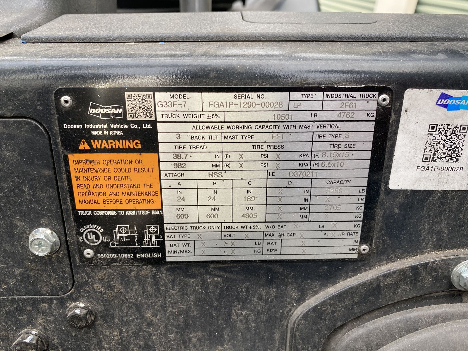 Venmo2022- Doosan G33E-7 LPG Forklift 5950 Lbs. Capacity