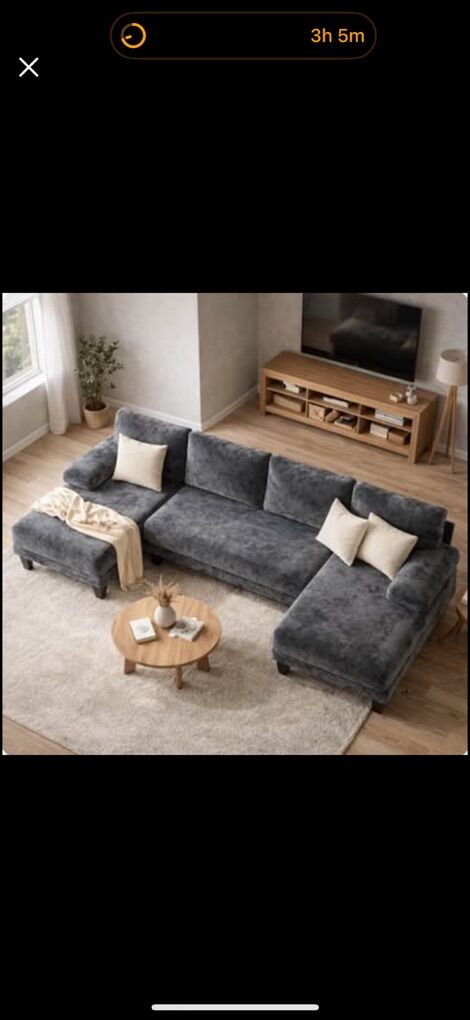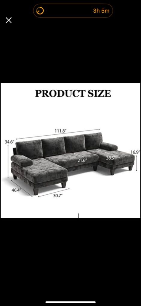 112” Spacious Dark Gray u-shaped sectional sofa. Big U-shaped couch with two chaises, one on each side. Super soft velour/chenille fabric Super comfy for movie nights or just hanging out. Overall length 111.8 inches. Overall height 34.6 inches. Left & Right chaise depth 46.4 inches. Seat height 16.9 inches. Great for a living room, loft, apartment, basement, theater room, etc.