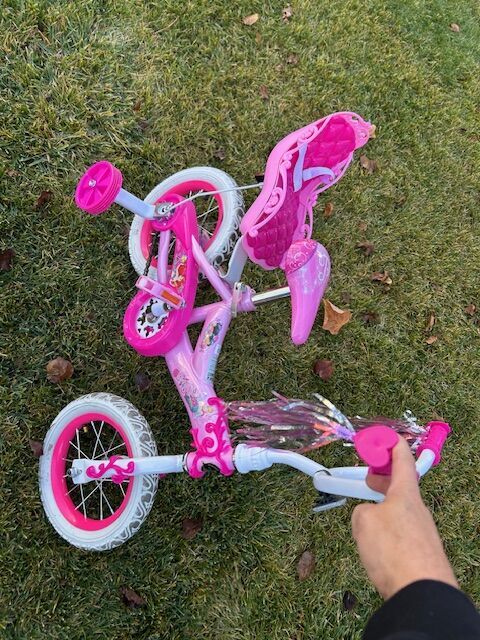 Venmo$50 OBO. This is an almost brand new Disney Princesses Huffey bike. It is a 12 inch bike. It is in perfect condition. It has a seat for your daughters favorite doll. Training wheels included. Ready to be used. Let me know if you have any further questions. Text preferred. Also, take a look at the other items I have for sale.