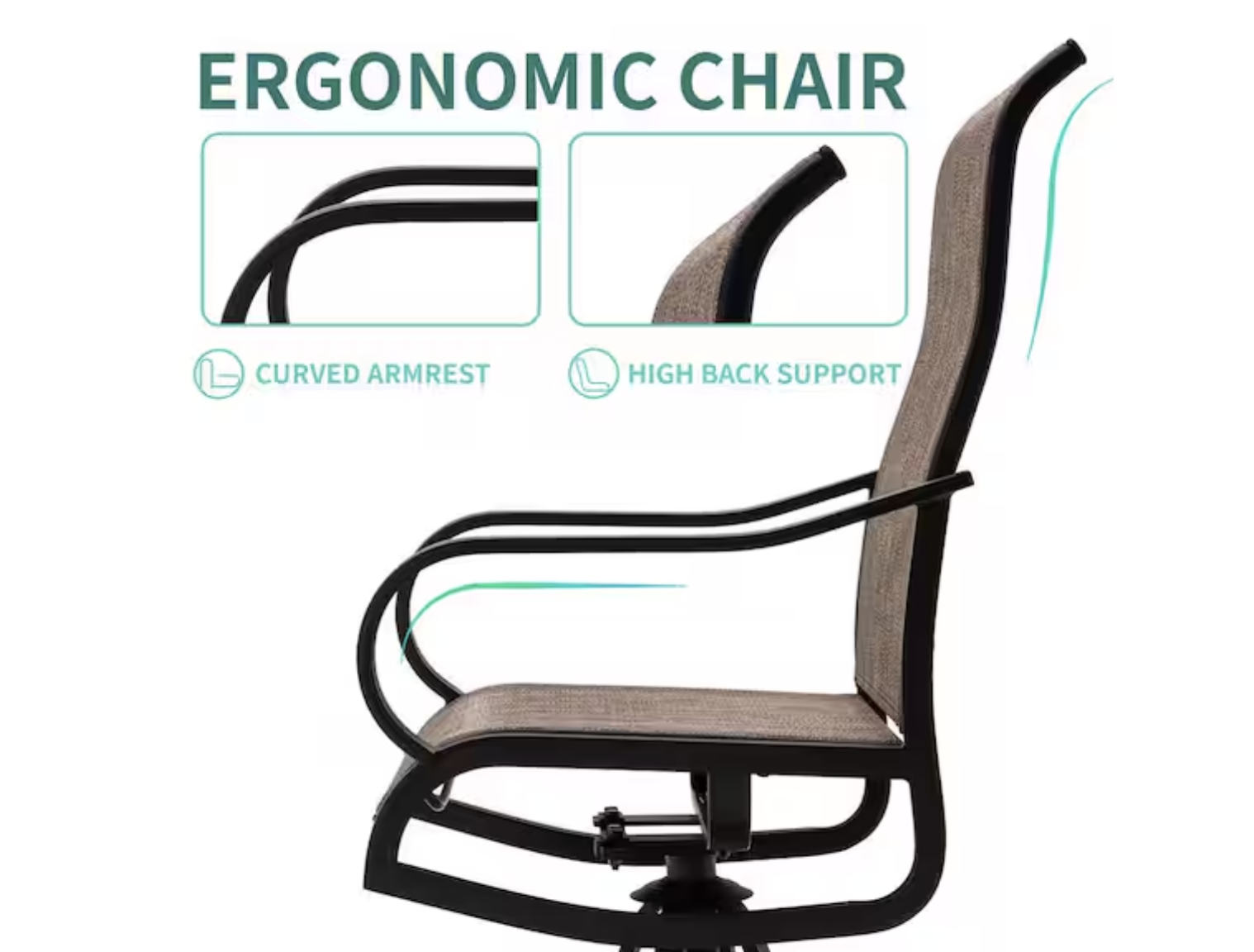 Our outdoor breathable sling swivel chair features a durable metal frame that is resistant to rust and weather damage, ensuring its longevity for many years of outdoor use. This high-quality outdoor furniture will elevate your living experience, providing both comfort and style. Comfortable swiveling outdoor dining chairs: dine in style with these outdoor dining chairs that offer 360° swiveling and a slight rocking motion for added comfort with a 400 lb. weight capacity, the ergonomic design of the seat and backrest provides the ultimate dining experience Durable all-weather PVC-coated polyester fabric: these outdoor furniture chairs are made with breathable PVC-coated polyester fabric that is rust and weather-resistant, making it easy to maintain Ideal for both indoor and outdoor use, they are perfect for your garden, deck, pool, kitchen, living room, or dining room High-back design and sturdy construction: featuring a high-back design for added comfort, these patio furniture chairs are also designed with a half-packed seat front for comfortable seating The metal frame is coated with powder and supports up to 440 lbs. With multiple combination options, each chair measures 19.2 in. seat width, and 41 in. height, with a 17.7 in. seat depth and 26 in. back height, choose from a variety of combinations, including outdoor chair sets of 2, 4, 6, and 8, dining tables, and patio dining sets Easy-to-clean textilene fabric: these chairs are made with textilene fabric, which is both stain-resistant and easy to clean, simply wipe with a damp cloth or hose down for a quick refresh, this fabric also dries quickly, making it perfect for both rainy days and everyday use, enjoy low-maintenance luxury with chairs that stay looking great with minimal effort