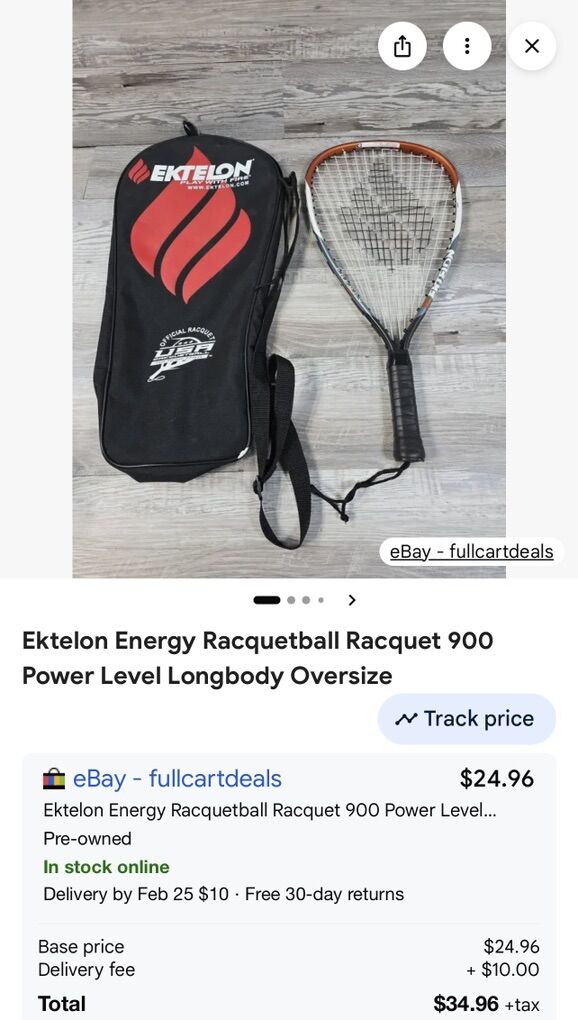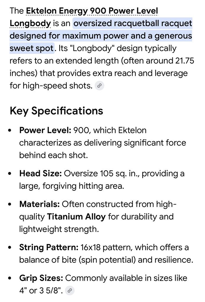 The Ektelon Energy 900 Power Leve! Longbody is an oversized racquetball racquet designed for maximum power and a generous sweet spot. Its Longbody design typically refers to an extended length (often around 21.75 inches) that provides extra reach and leverage for high-speed shots. ¿ Key Specifications • Power Level: 900, which Ektelon characterizes as delivering significant force behind each shot. • Head Size: Oversize 105 sq. in., providing a large, forgiving hitting area. • Materials: Often constructed from high-quality Titanium Alloy for durability and lightweight strength. • String Pattern: 16x18 pattern, which offers a balance of bite (spin potential) and resilience. • Grip Sizes: Commonly available in sizes like 4 or 3 5/8 •