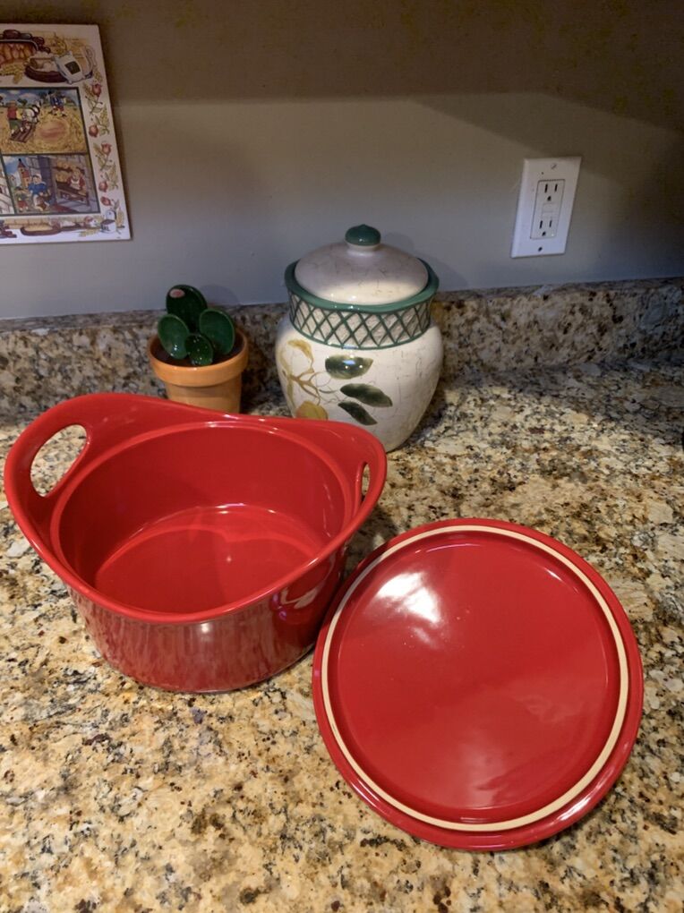 VenmoThis is a 2.75 quart baking dish in a vibrant red color. Crafted from high-quality ceramic material with a glossy surface coating, this dish is both heavy, durable and stylish. Bottom shows usage, but there are no scratches or chips or cracks on dish. So pretty it can go on the dining table. Clean and ready to go. Venmo or Cash. Non-smoking/No pet home
