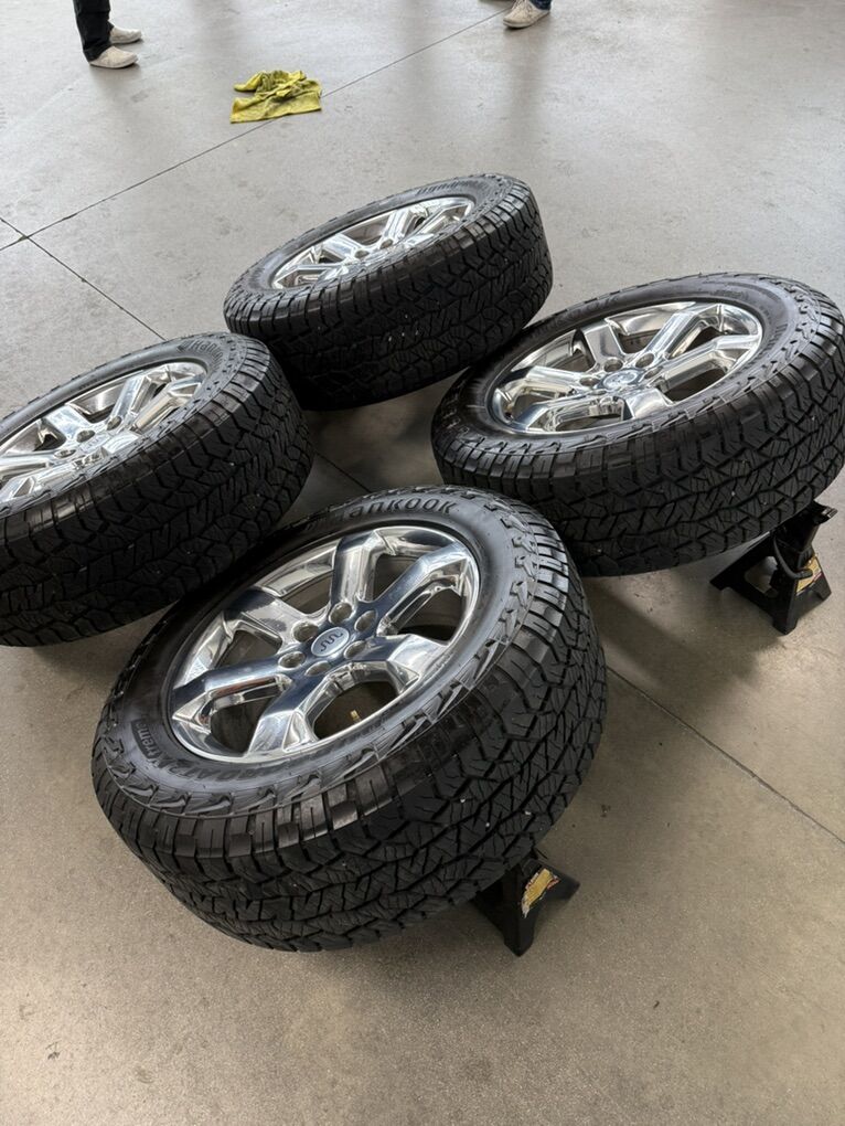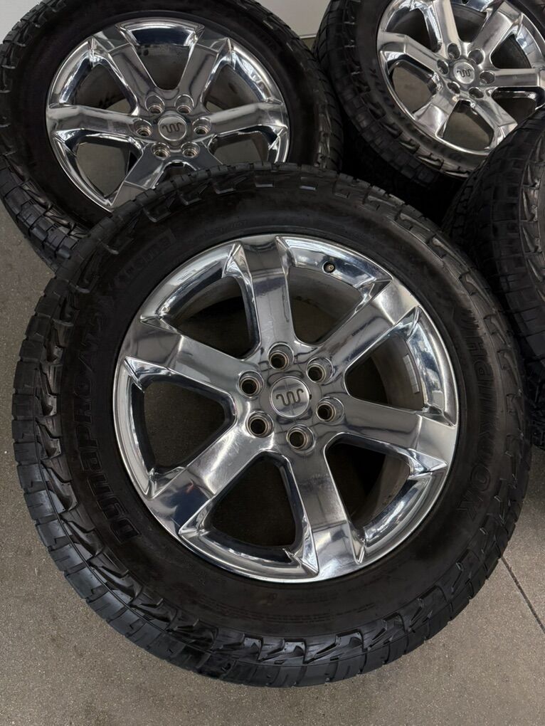 Wheels are 18x9, 0 offset, arena “trophy” wheels, top of the line wheels, amazing looking set. Wheels are in perfect shape, no damage on them, they look as if they just came out of the box. All of the center caps are also included and in mint shape. Tires are 35x12.50r18 prevail m/t, load range E, 10ply, top of the line tires. No patches or plugs in them, tires have less then 500 miles and are pretty much new